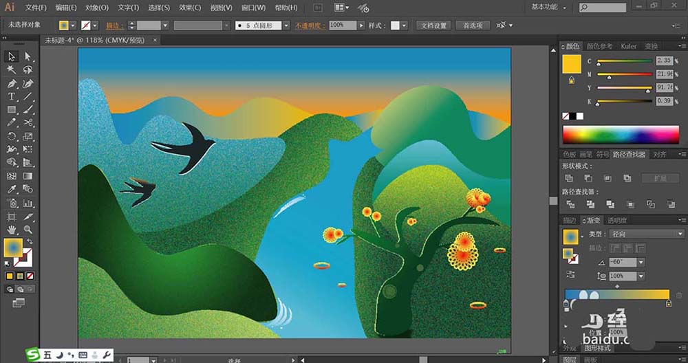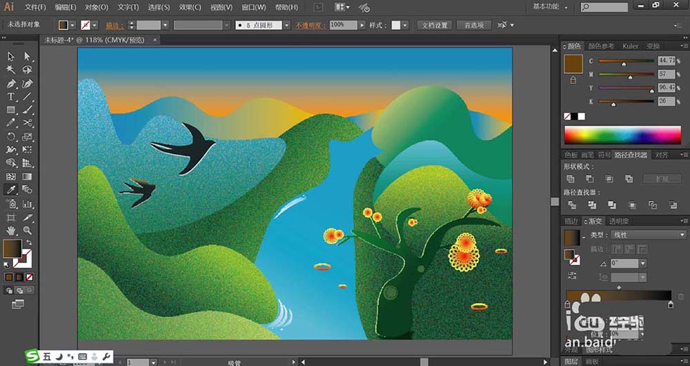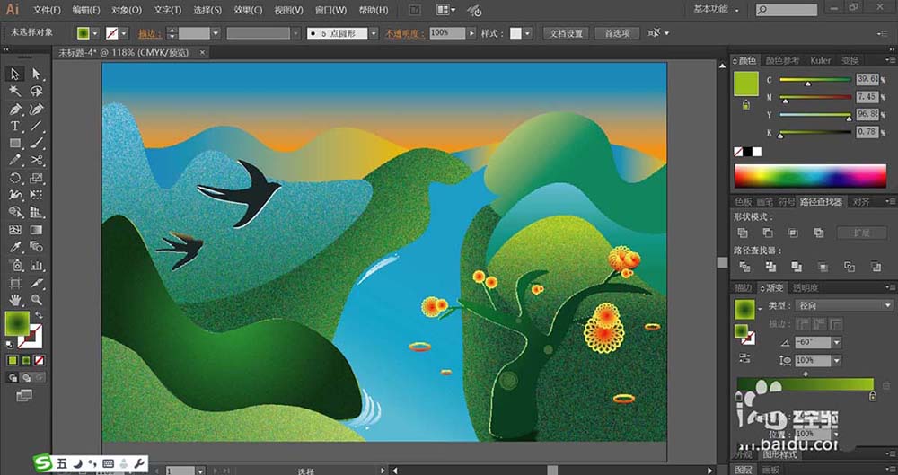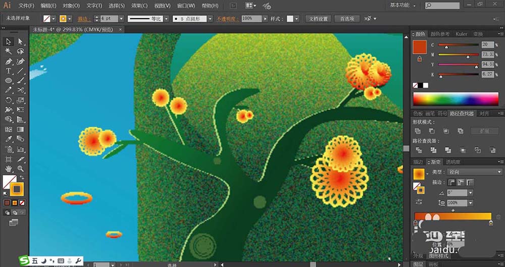 7、最后,我们画出大树的路径与小花朵的路径,再用桔红色到橙色的渐变填充花朵,用深绿色的渐变填充大树,完成春天风景画设计。