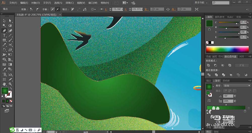 5、继续使用钢笔画出小河两边的高山的路径,分别填充草绿色的渐变,青绿色的渐变,从而让高山的绿色调有所变化。