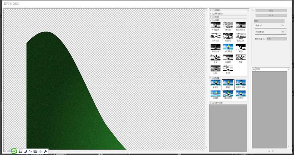 4、使用钢笔画出小鸟下方的高山的路径,再用深绿色的径向渐变填充,接着,我们使用滤镜工具为高山增添颗粒效果,让颗粒材质的高山呈现在画面上。