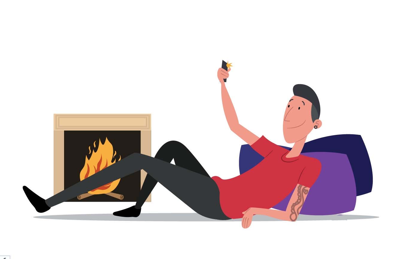 1、使用钢笔画出宅男的身体轮廓,重点绘制手部的动作与手里的手机,再画出宅男的表情与身后的枕头,壁炉的细节路径。