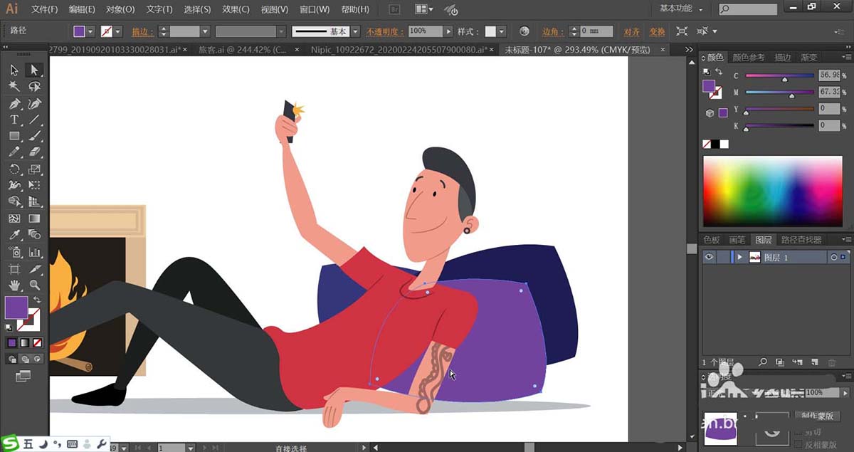 5、使用紫色填充男子身后的枕头,再用深蓝色与蓝黑色分别填充身后的枕头的路径。