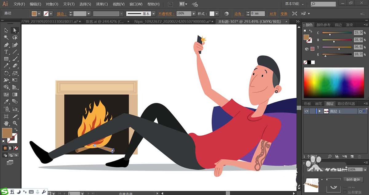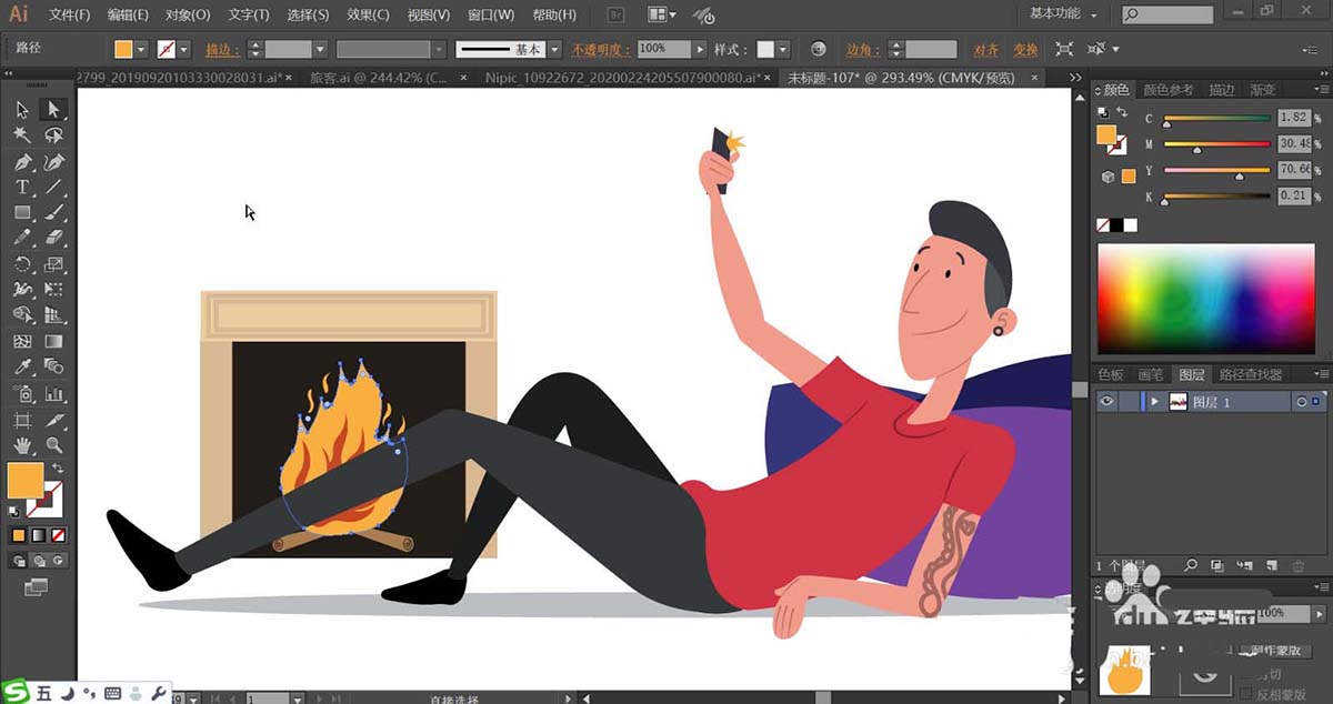 7、最后,我们用橙色填充火苗的外边缘,再用红褐色填充火苗的内部,使用土灰色填充木棒的路径,完成宅男形象设计。