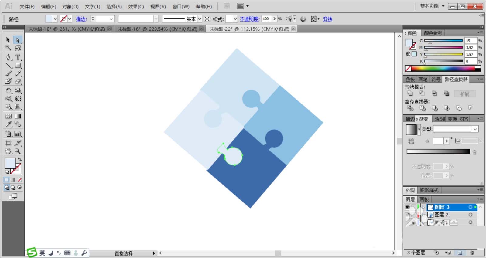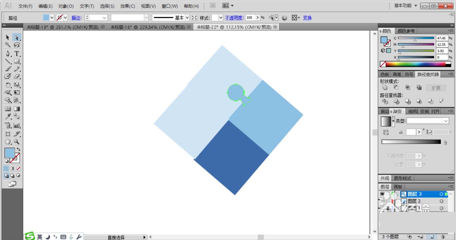 2、使用圆形与钢笔工具画出小正方形之间的插口结构件,再用对比度高的蓝色填充这些插口,让明暗色彩以对比效果呈现在表面之上。