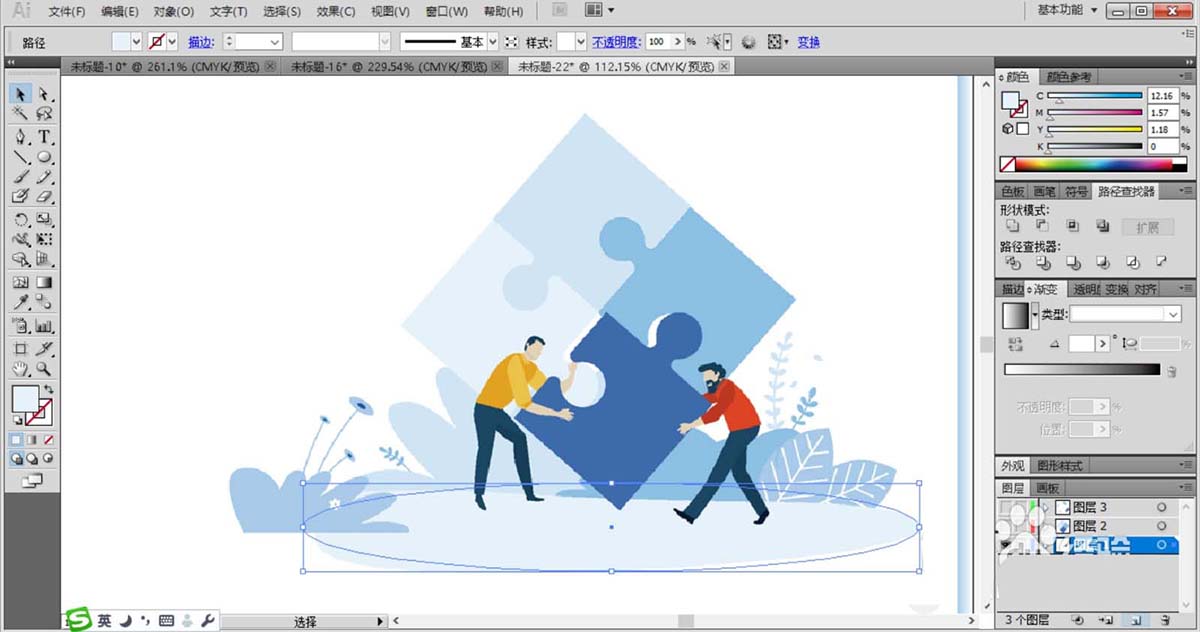 5、接着,我们使用圆形画出地面并用天蓝色填充放在所有的元素的最底层。