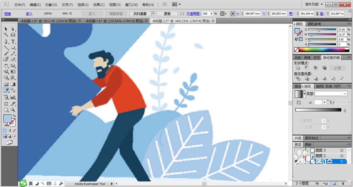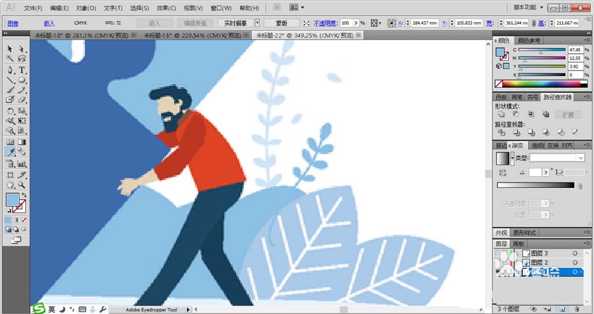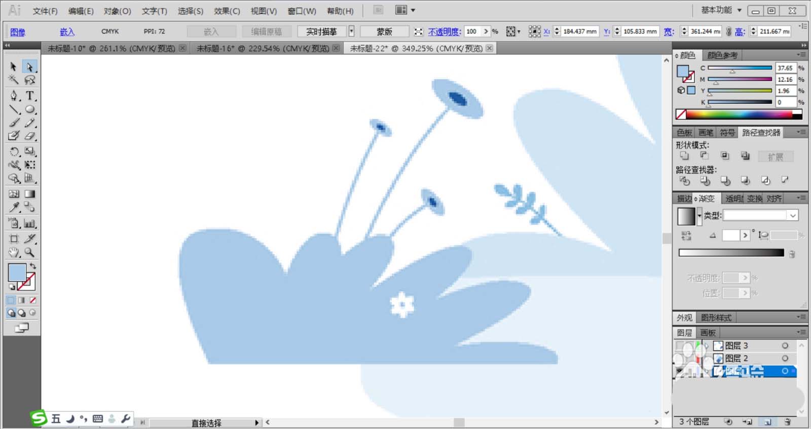 6、使用钢笔车出地面左侧的植物并用天蓝色填充,再画出上面的花朵,使用深浅搭配的天蓝色填充。