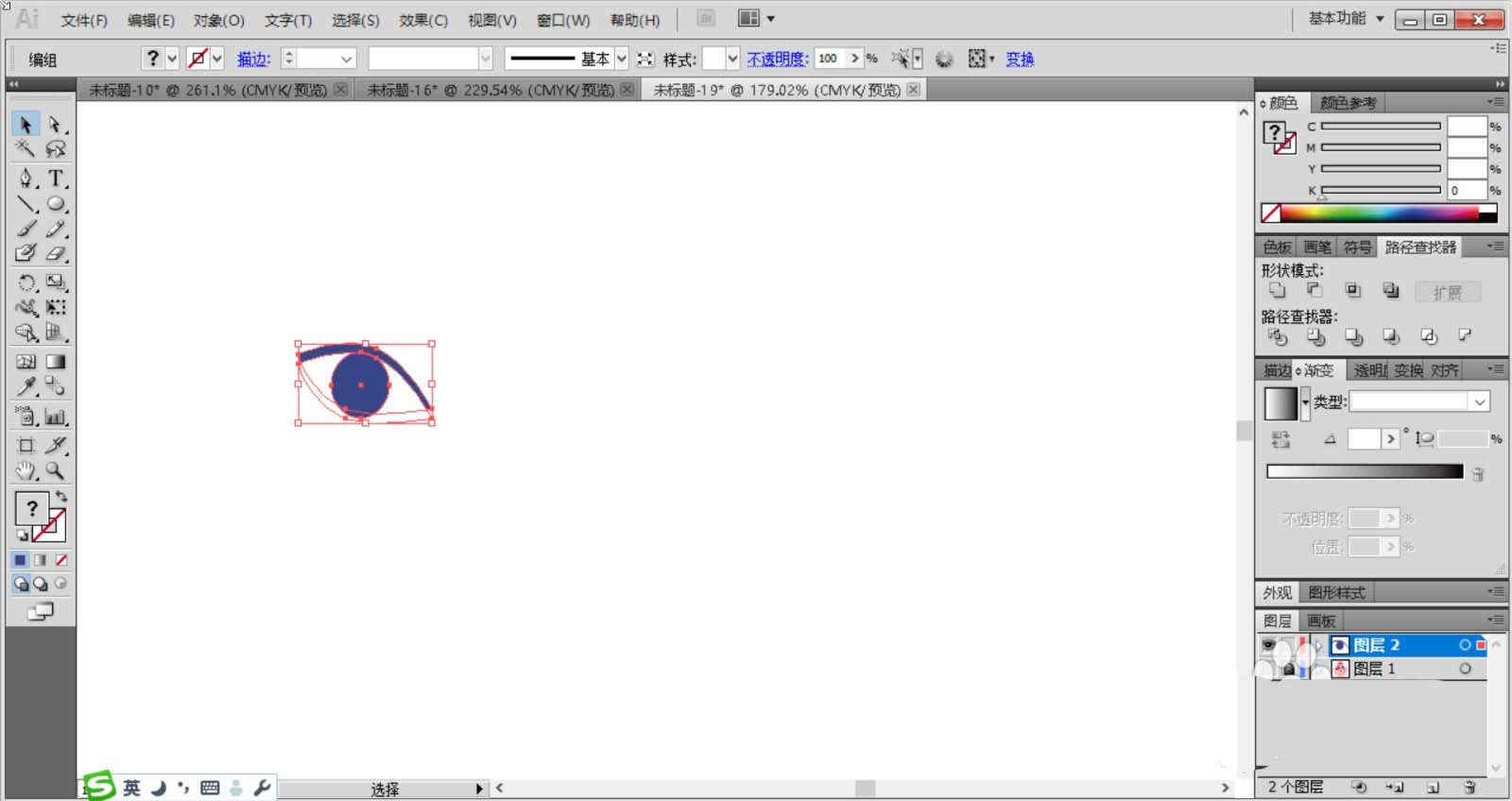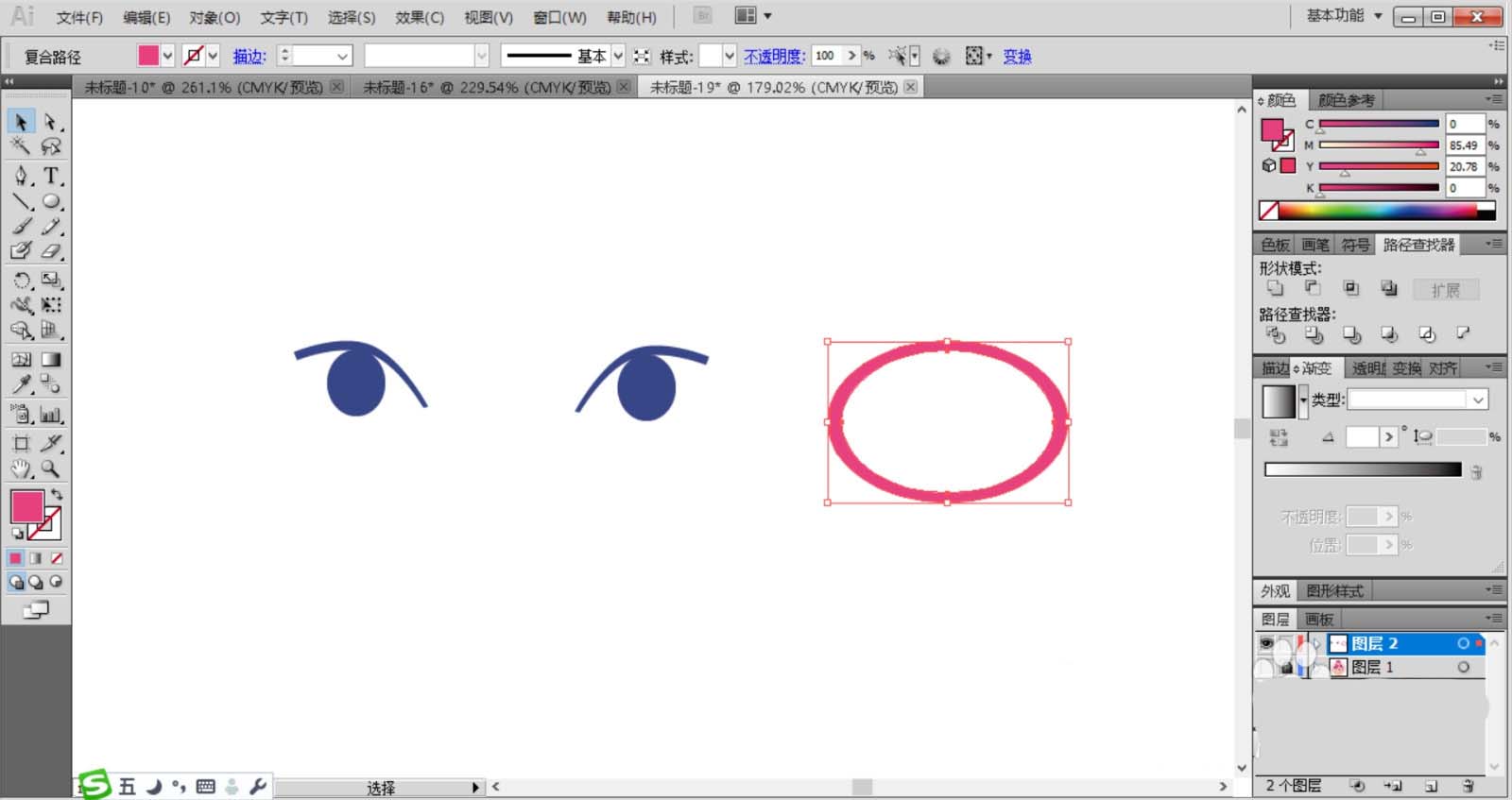 1、使用圆形工具画出女子的眼晴,瞳孔使用两个圆形绘制并用深蓝色填充,再用白色填充高光点,眼白与睫毛使用两个椭圆形绘制并用白色与深蓝色填充,眉毛使用两个圆形裁剪出来,再用矩形剪去不需要的部分形状填充粉红色。