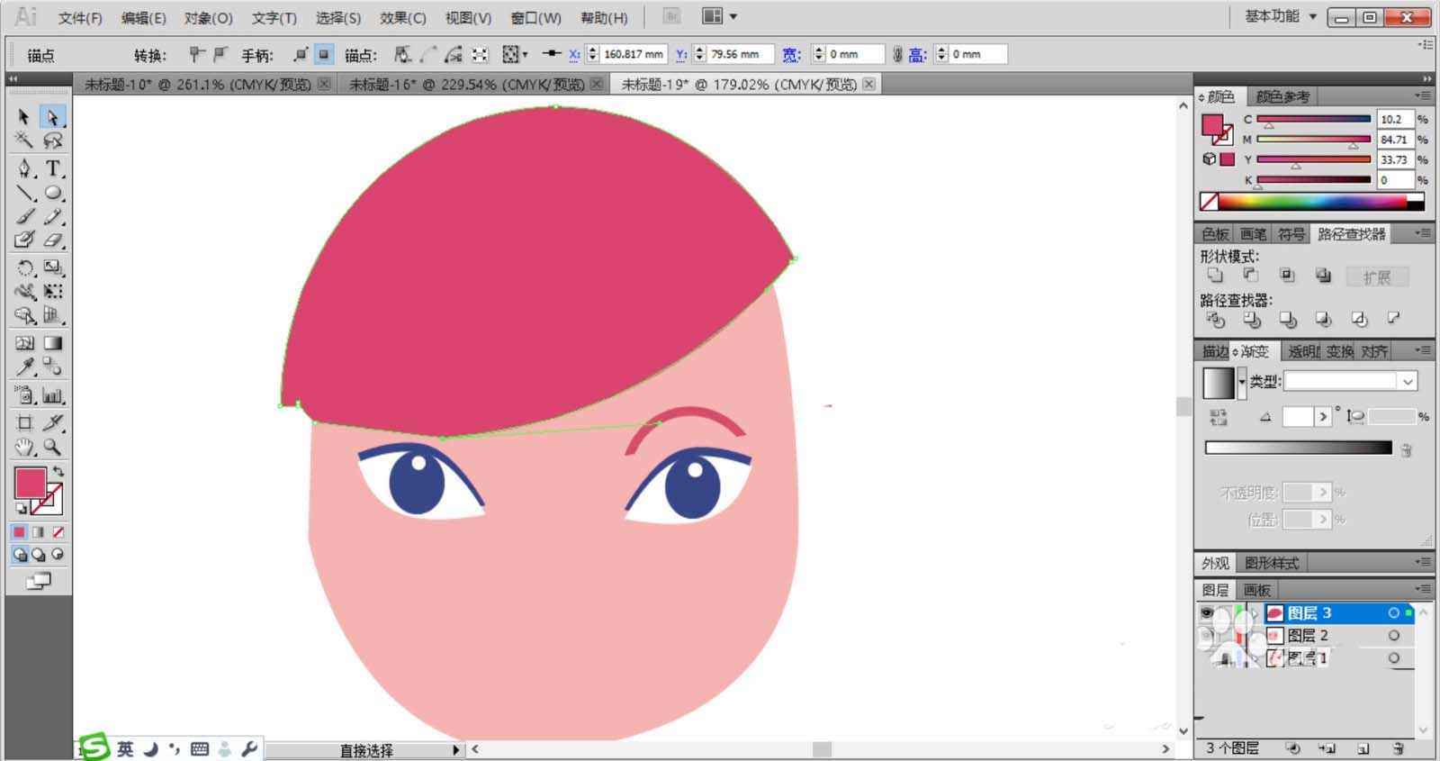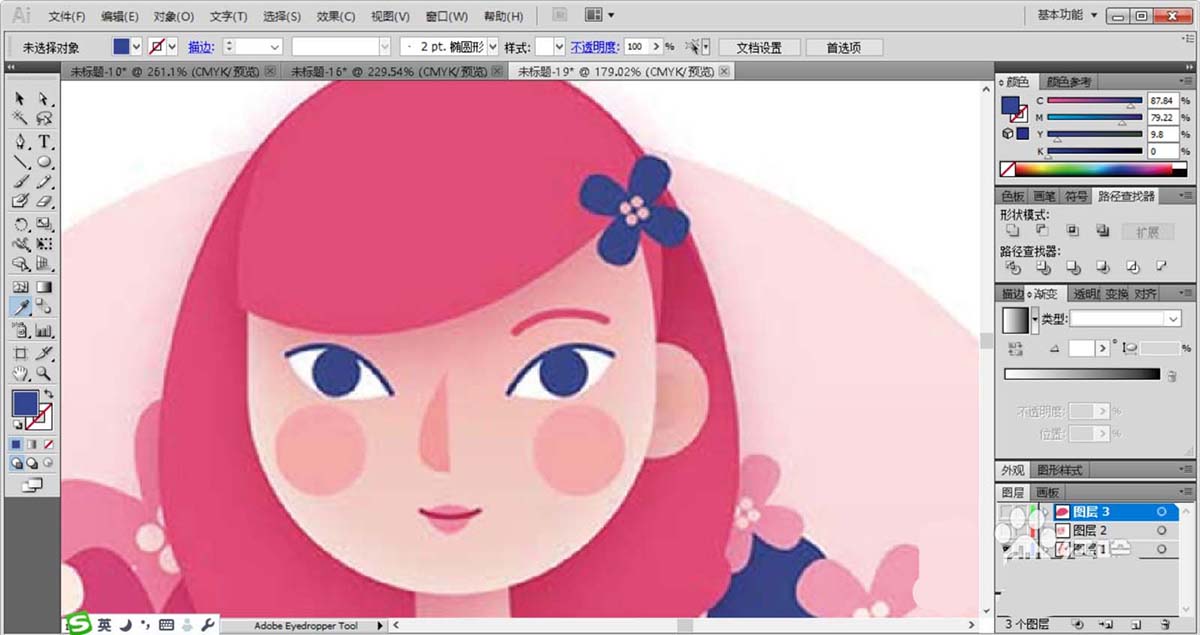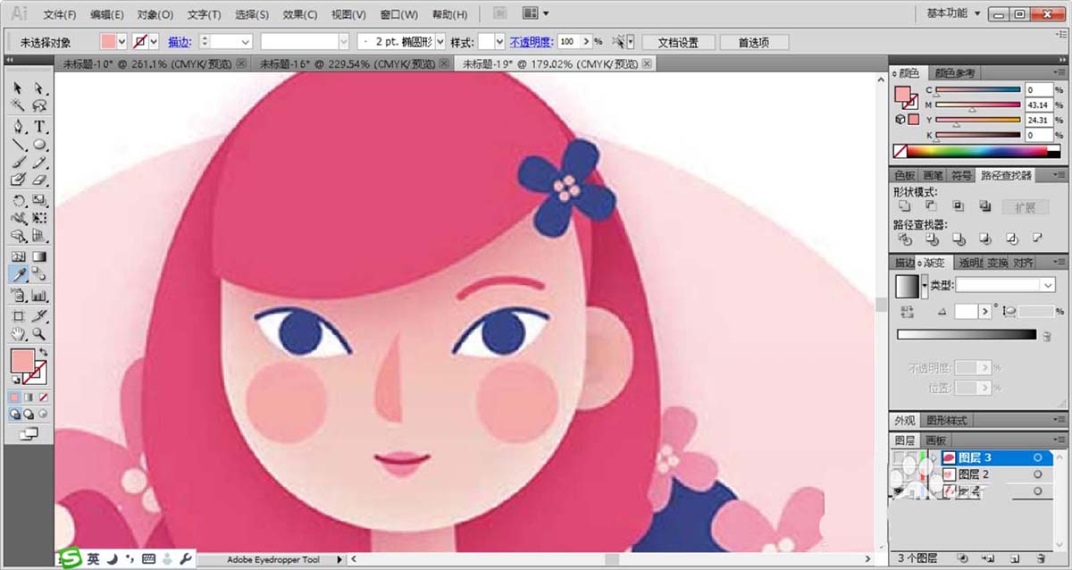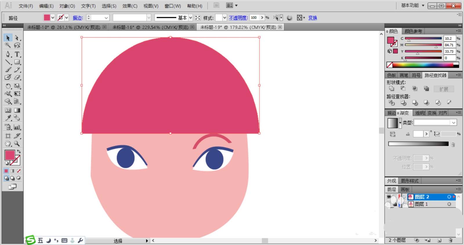 2、复制眼晴让其分布在脸蛋上面,女子的脸蛋使用粉红色填充,女子的头发使用品红色填充,头发使用半圆形绘制并用钢笔工具裁剪成波浪边缘的形状。