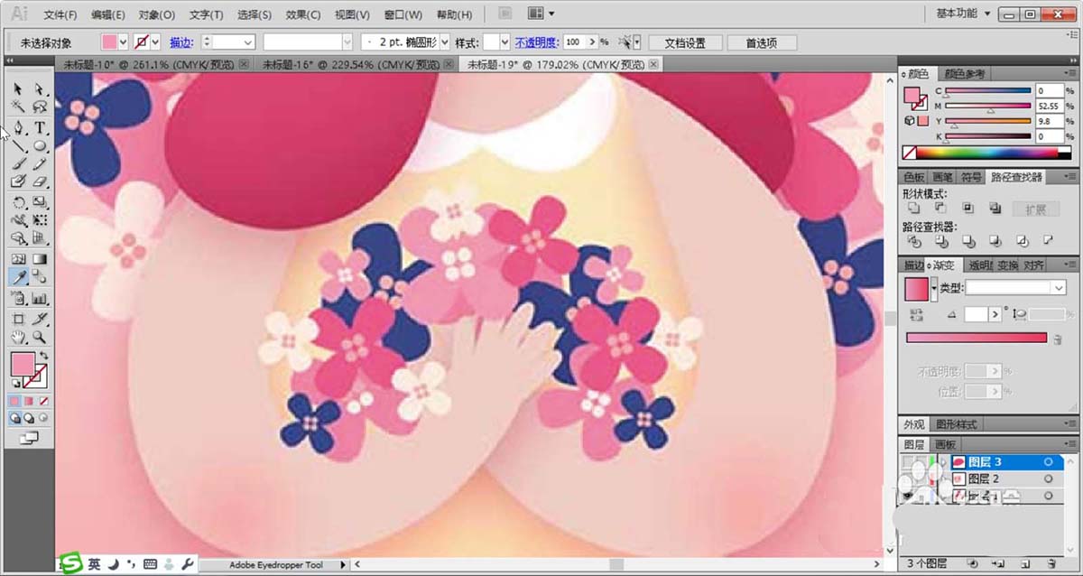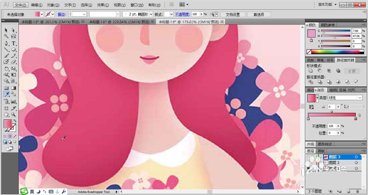 6、女子的裙子使用黄粉色的渐变填充,身体后面的背景使用桃红色的渐变填充。