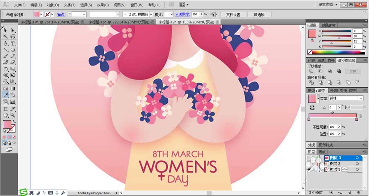 7、最后,我们用粉红色填充女子裙子上面的文字,完成女神节插画设计。