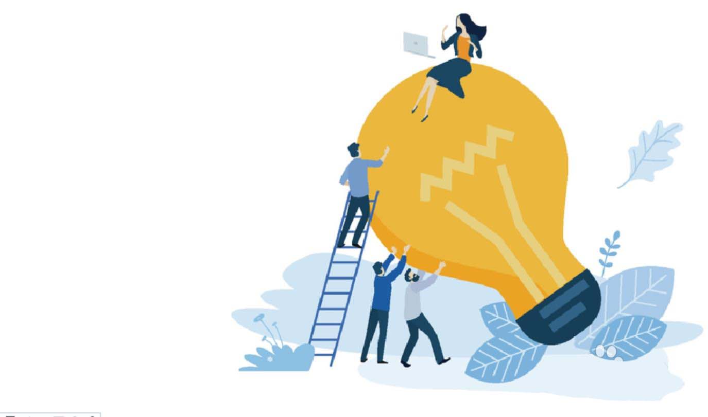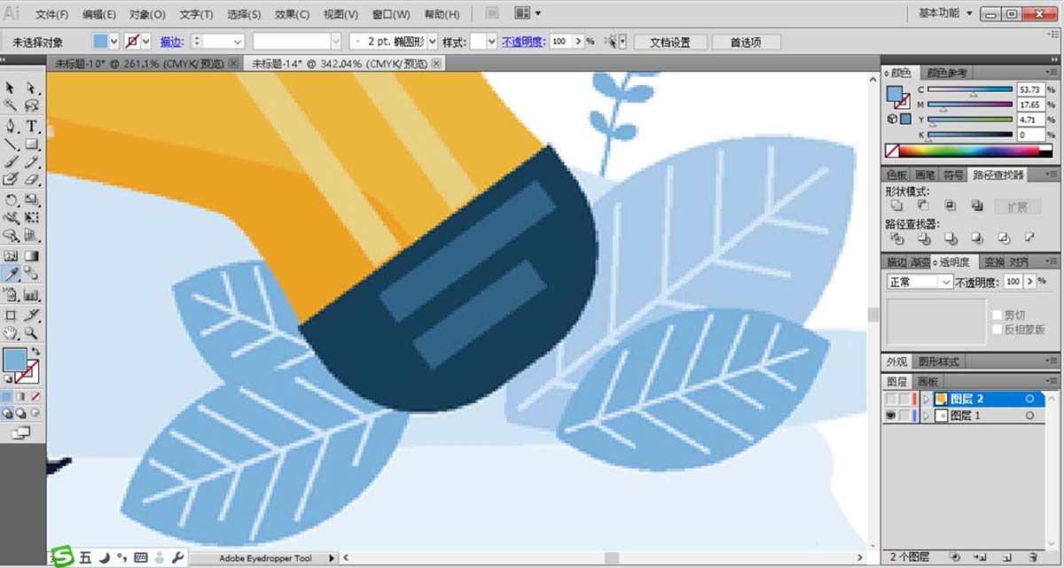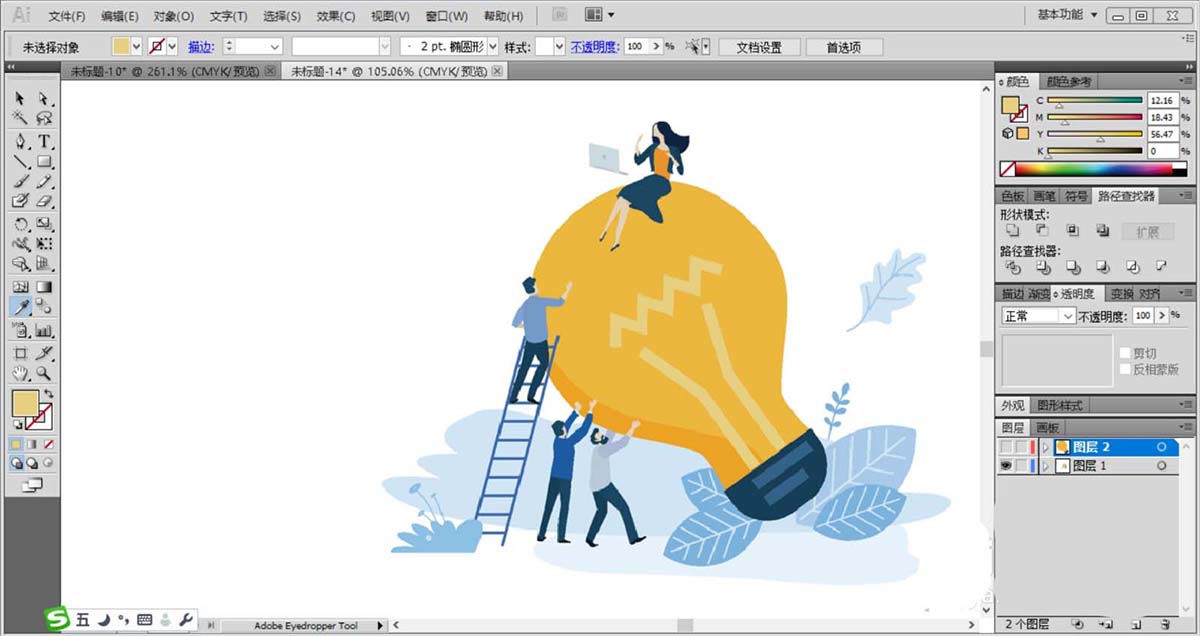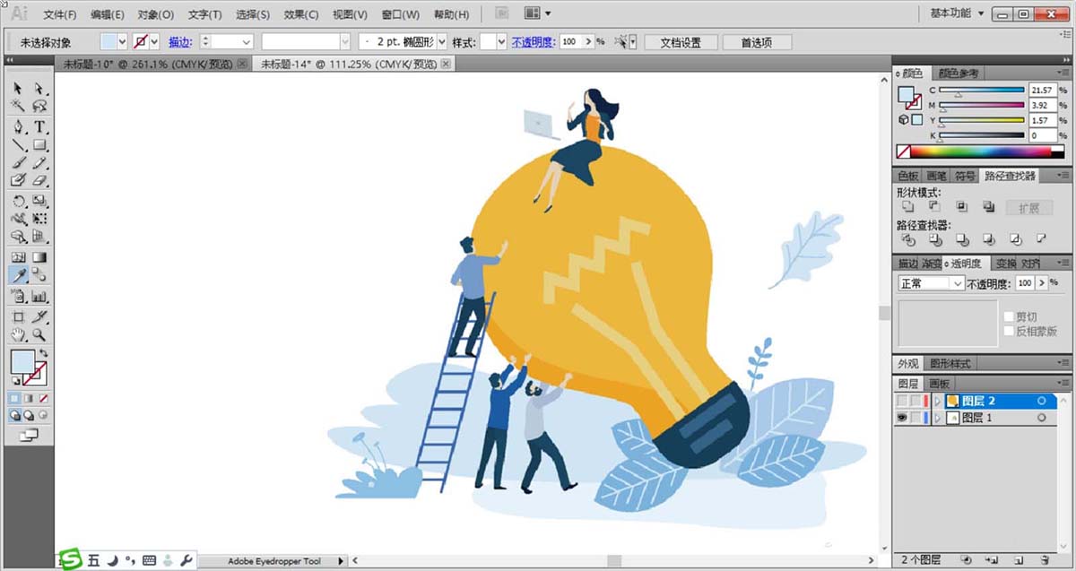 7、最后,我们画出灯泡下方的多个不同大小的叶片路径,使用不同明度的蓝灰色与白色搭配填充叶片的主体与内部的路径,再用天蓝色填充灯泡的阴影路径,完成灵感场景画设计。