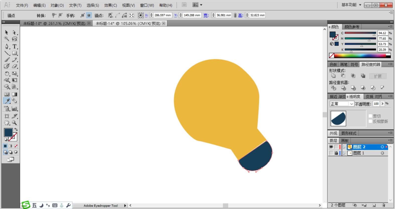 2、使用橙黄色填充灯泡的上部,再用蓝黑色填充灯泡的下部,接着,我们画出灯泡内部的灯芯的路径。