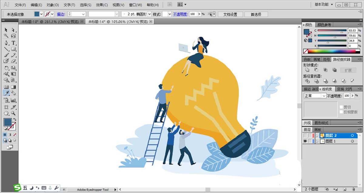 5、继续画出灯泡下方的男子的身体动作,使用深蓝色与蓝黑色填充左侧男子的上衣与裤子,使用灰色与蓝黑色填充右侧男子的上衣与裤子路径。