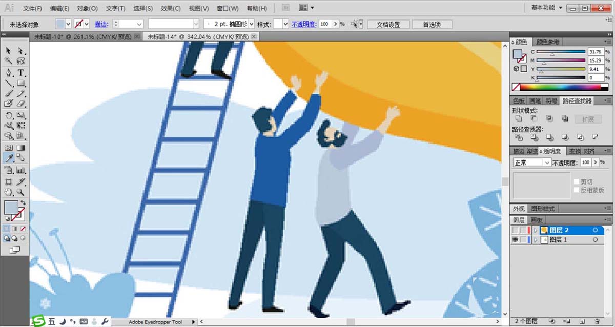 6、使用直线工具画出长梯的路径,再用钢笔描绘出梯子上面的男子的身体动作路径,使用深蓝色填充梯子,再用蓝灰色与蓝黑色搭配填充男子的上衣与裤子。