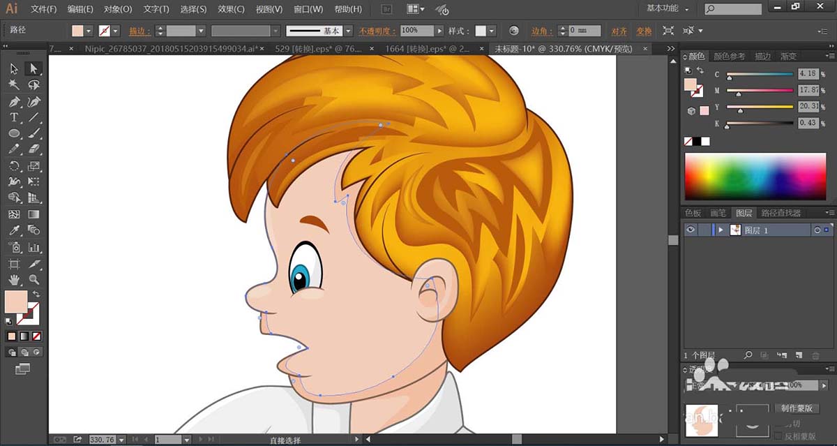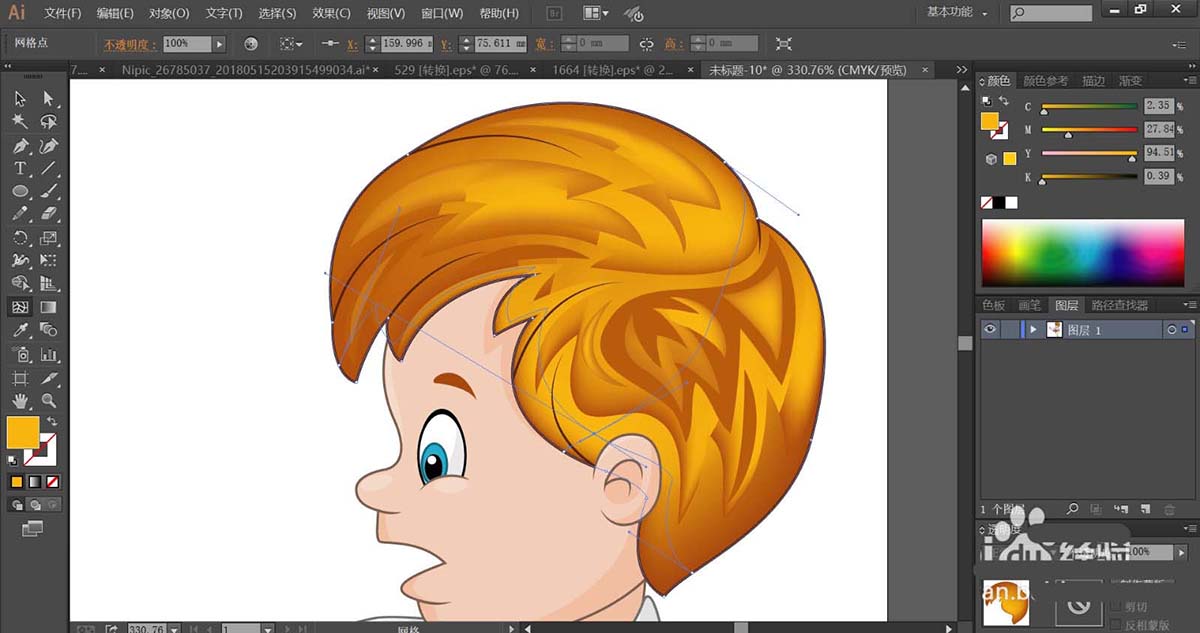2、使用暗橙色与橙黄色搭配填充男孩的头发,再用网格工具点击一下头发的橙黄色路径让其呈现渐变色的效果。
