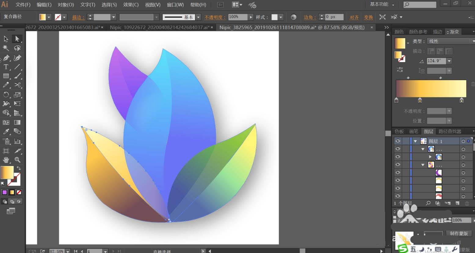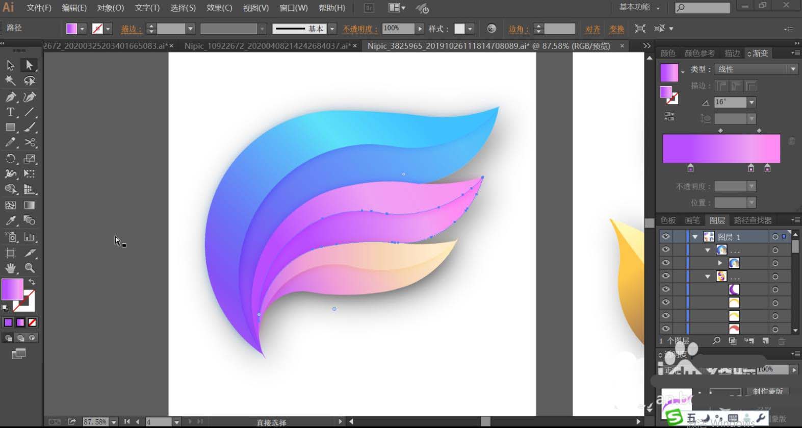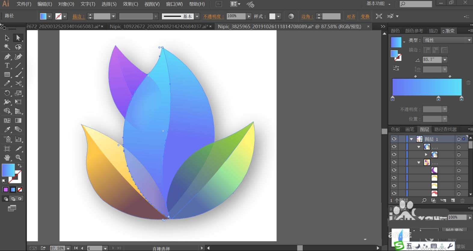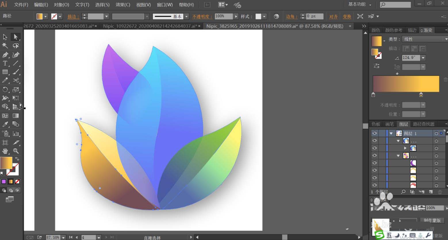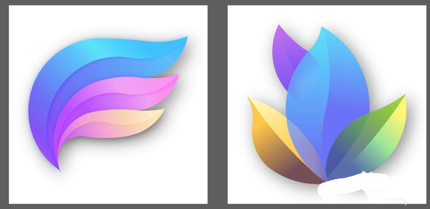 7、最后,我们再使用黄绿色的渐变填充右侧叶片的左右结构,让色调变化呈现在右侧叶片上面。最后用紫色的渐变填充上方左侧的小叶片,再用半透明的紫色渐变填充紫色叶片与蓝色叶片交际的地方,让其呈现半隐的效果,完成抽象叶片设计。
