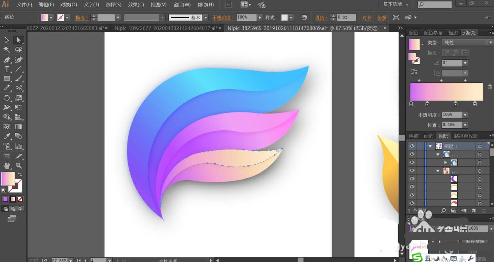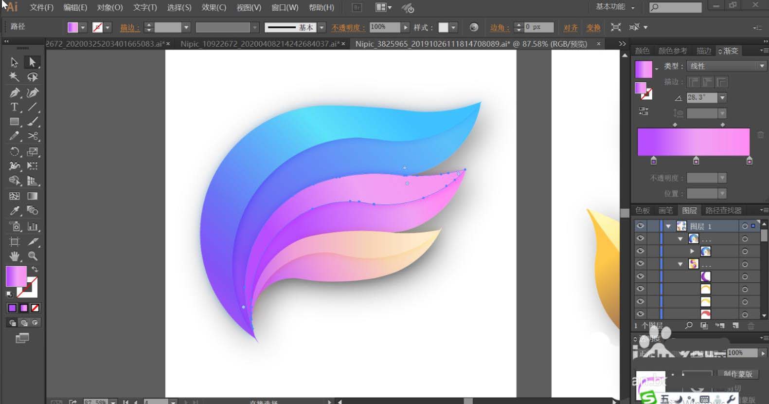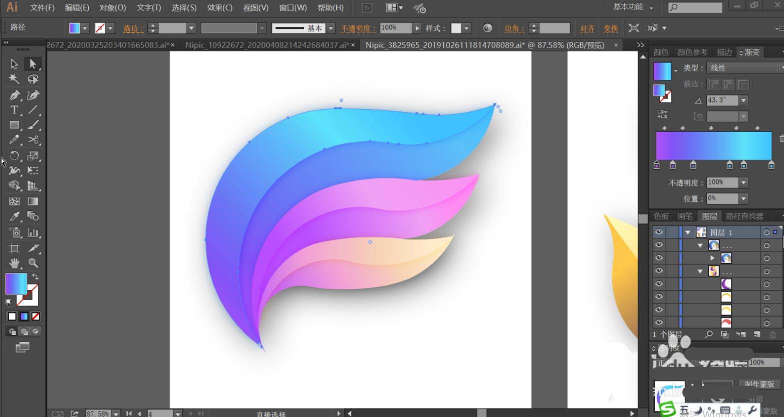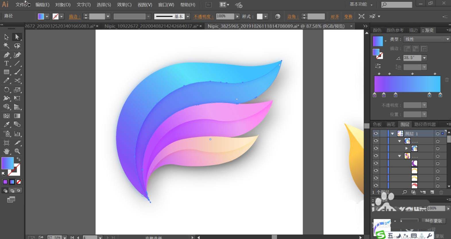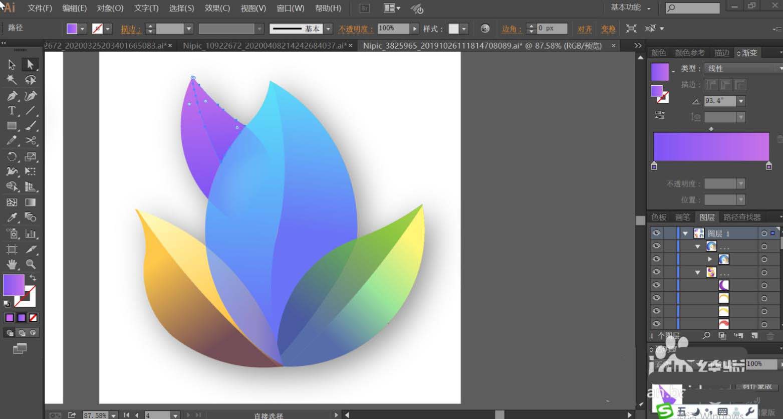 7、最后,我们再使用黄绿色的渐变填充右侧叶片的左右结构,让色调变化呈现在右侧叶片上面。最后用紫色的渐变填充上方左侧的小叶片,再用半透明的紫色渐变填充紫色叶片与蓝色叶片交际的地方,让其呈现半隐的效果,完成抽象叶片设计。