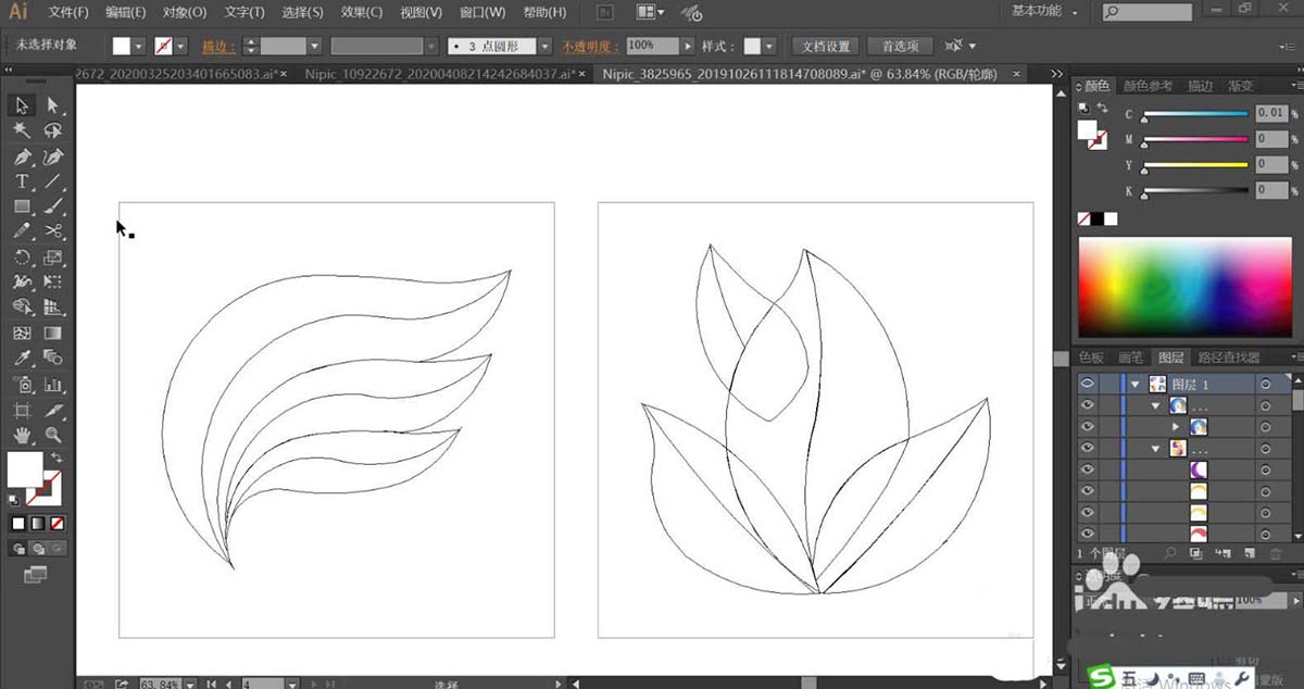 1、使用钢笔工具画出左侧叶片的圆弧,再通过变换大小工具让圆弧慢慢变小成为一团叶子,右侧的叶片使用钢笔绘制出左侧路径,再通过对称工具画出右侧的叶片路径。