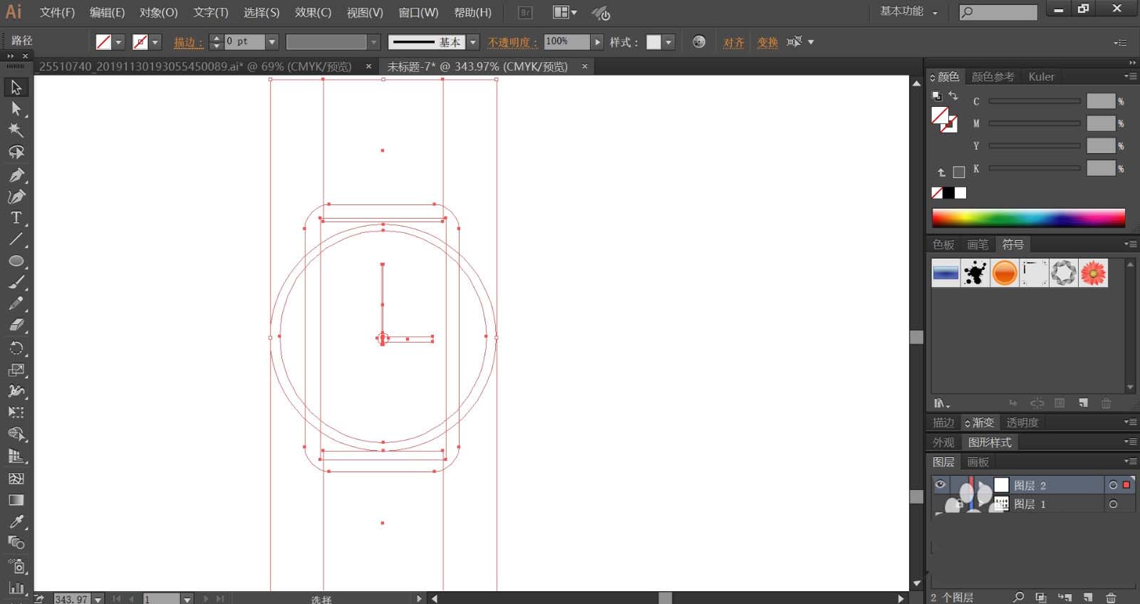 1、首先,我们用圆形工具画出手表的表面圆形内外结构路径,再用矩形画出手表的边框路径,绘制出手表的指针路径,再画出表带的路径。
