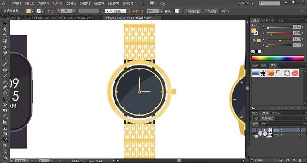 6、金表的设计体现在金色的表带花纹上面,表盘我们使用蓝黑色与金色分别填充表面与指针的路径,让对比色来呈现金表的质感。