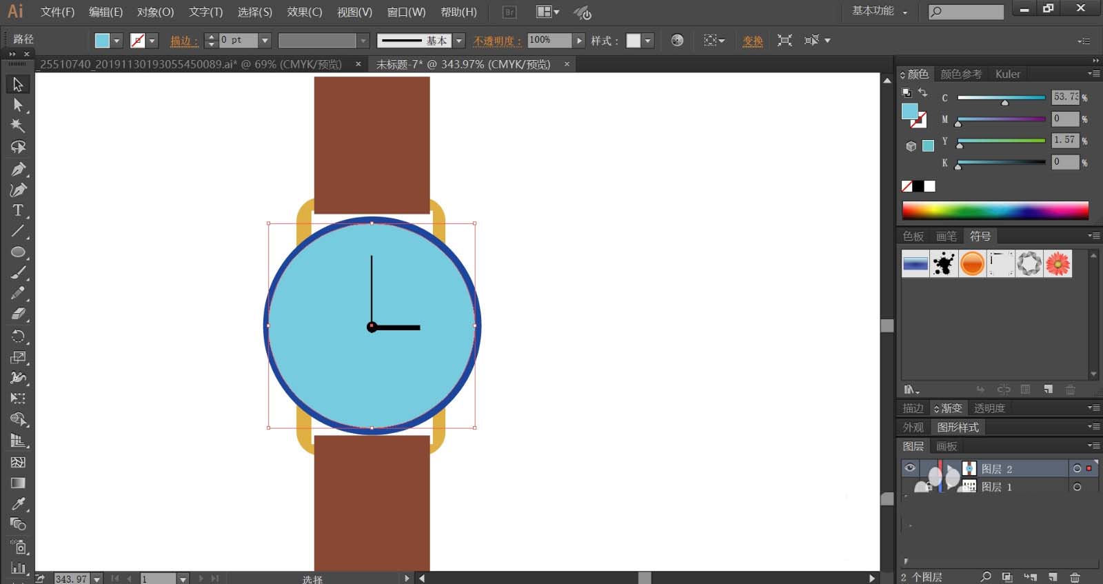 2、我们用红棕色填充表带,再用纯蓝色与深蓝色搭配填充表盘的内外路径,表盘的外框使用金黄色填充。