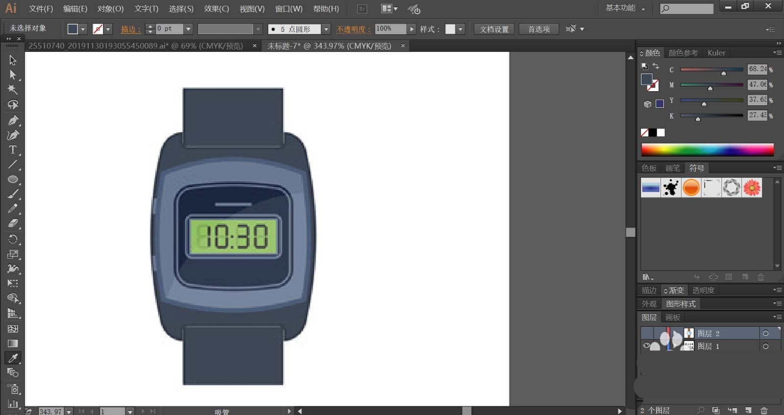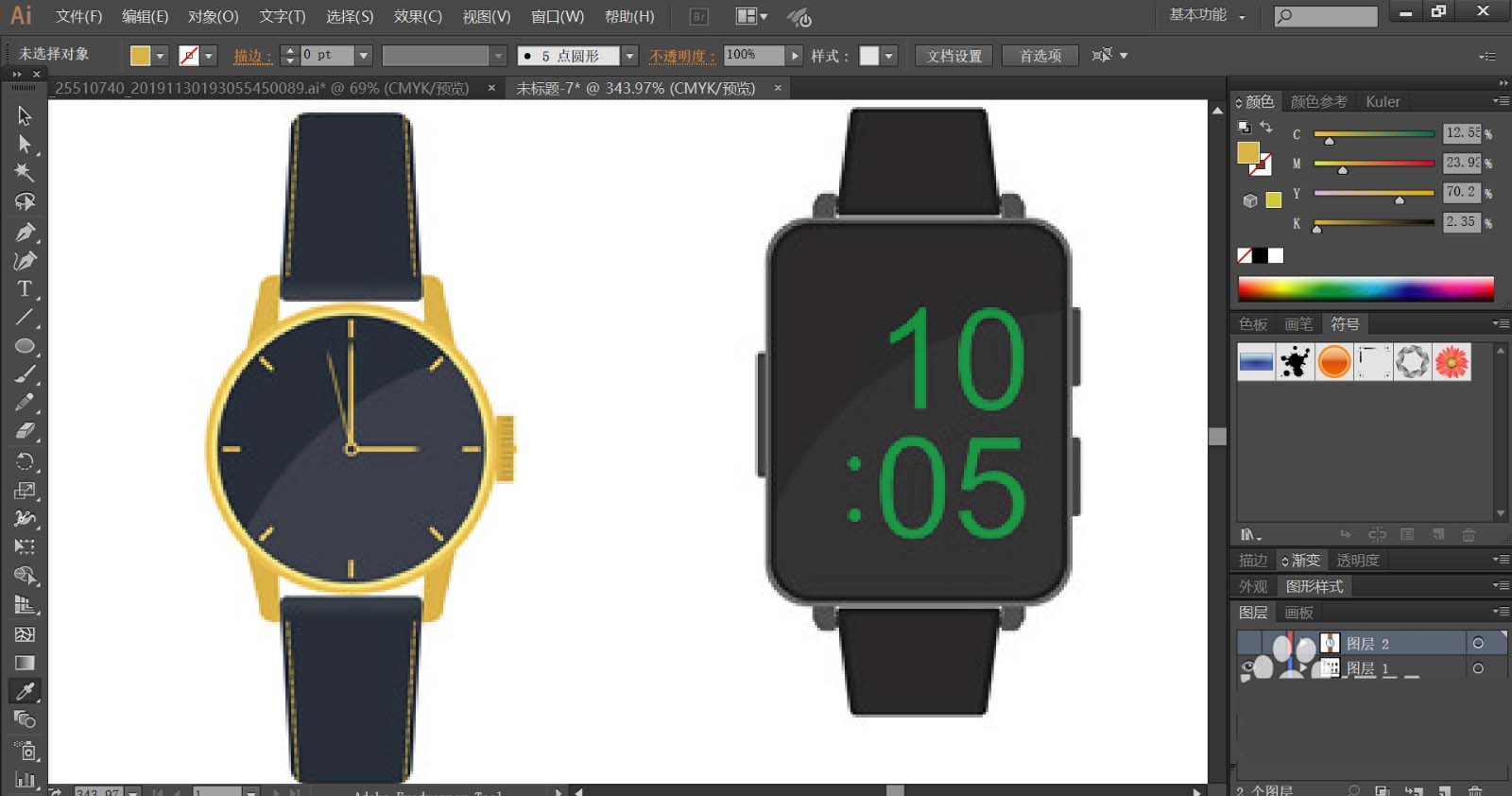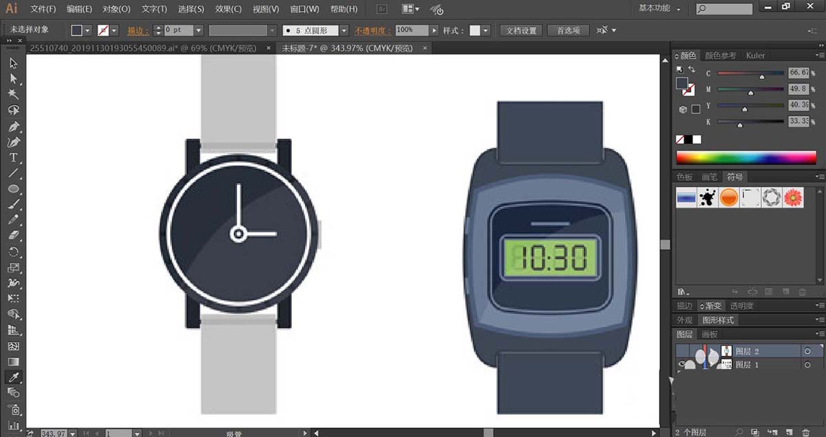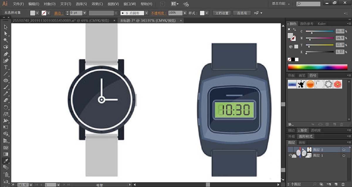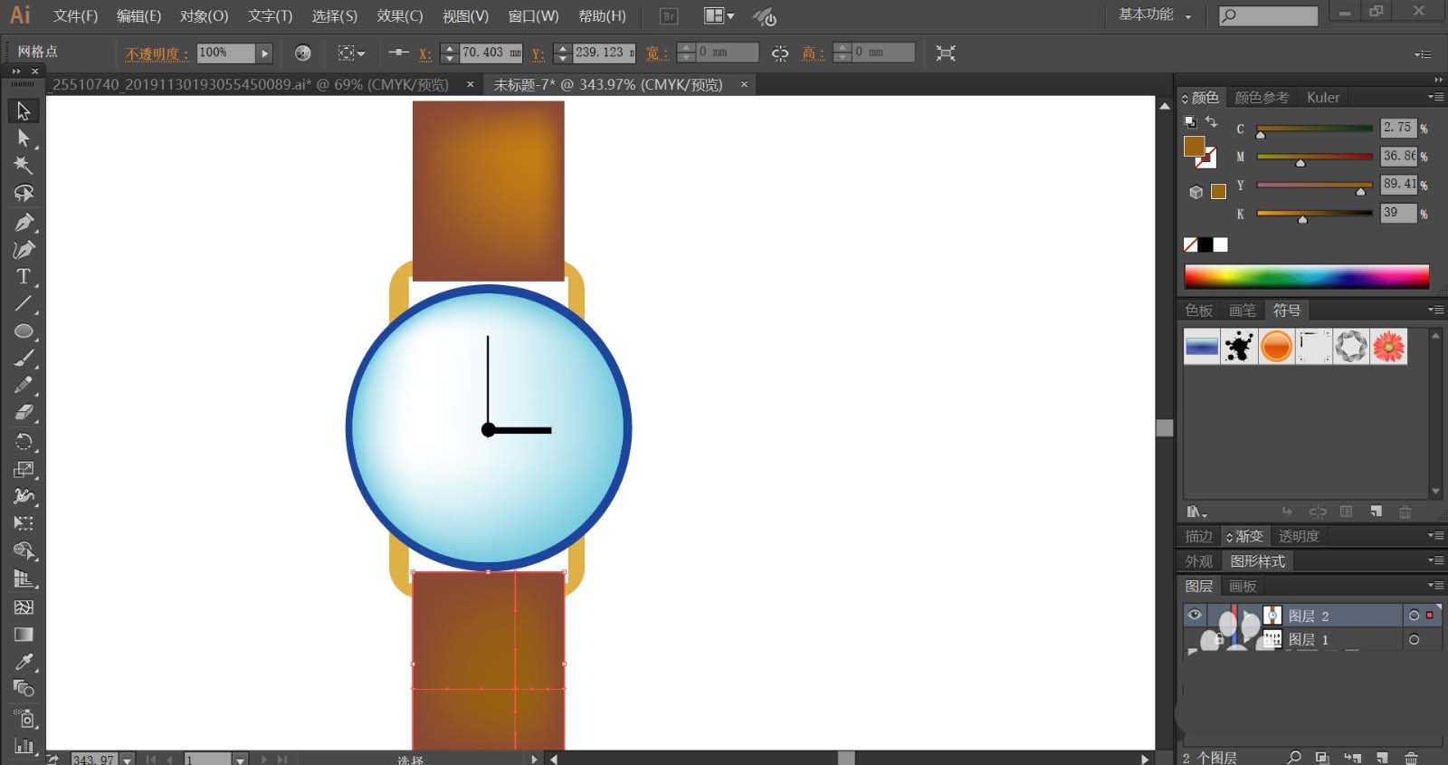 4、使用网格工具点击一下表带,让其呈现红棕色的渐变效果,绘制完成一只手表之后,我们再来绘制另外一只手表,我们使用蓝黑色填充表盘,再用灰白色填充指针与表带,手表也可以呈现质感的效果。