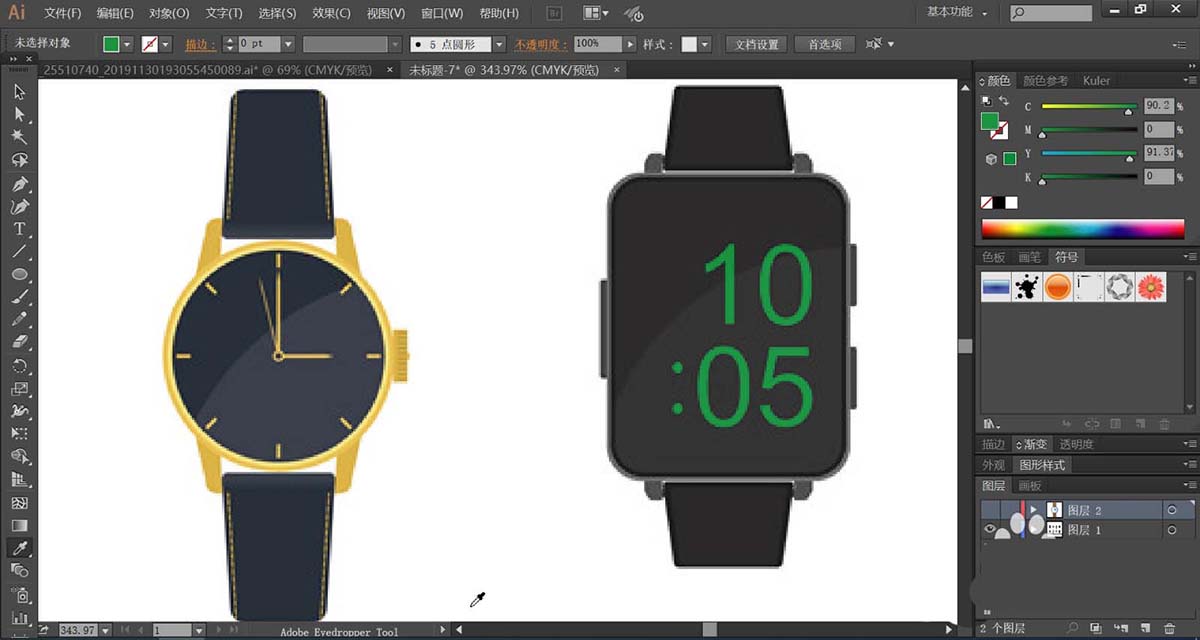 7、我们也可以使用金色的渐变来填充表带与表盘的边框从而呈现金属的质感,再用蓝黑色填充表盘。电子表也可以使用蓝黑色与绿色搭配从而呈现一个极简的效果,完成手表造型设计。