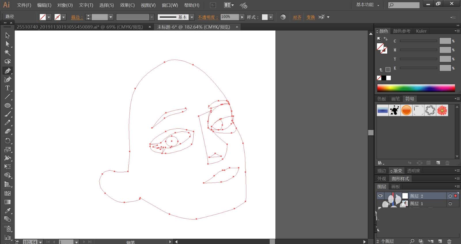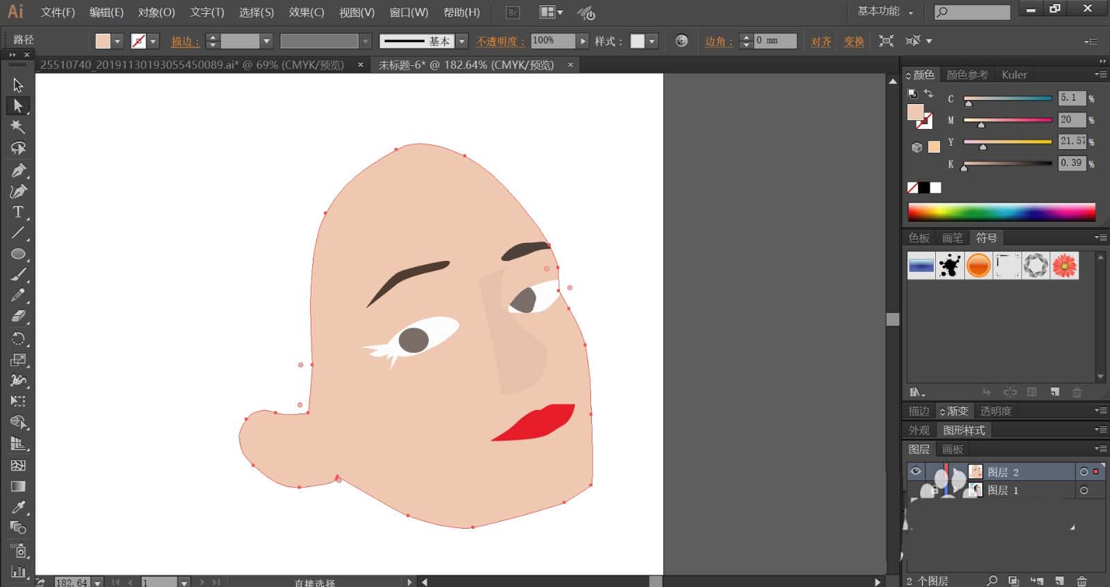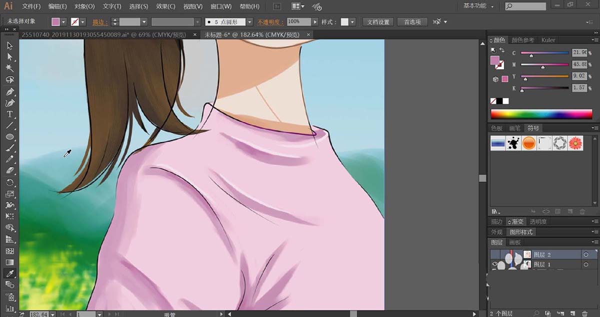 使用暗粉色与亮粉色搭配填充女孩的脖子路径,再用暗粉色填充头发在脸蛋上面的影子路径。