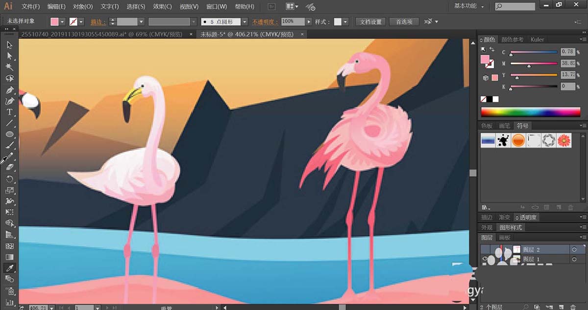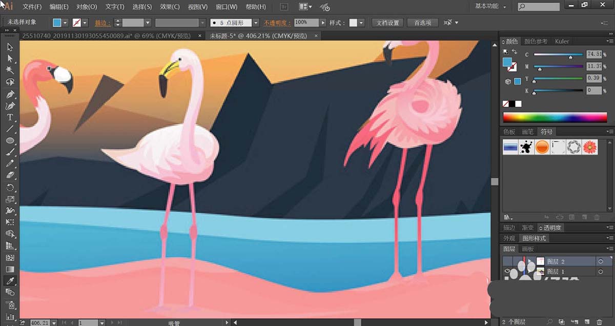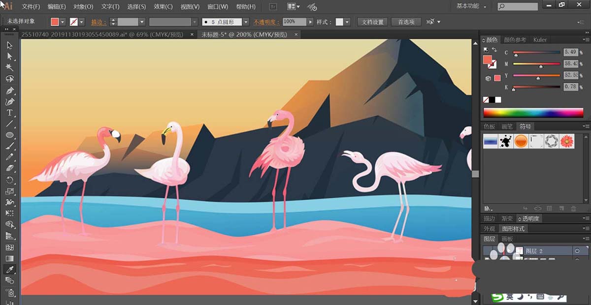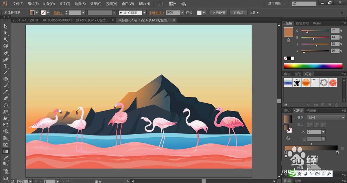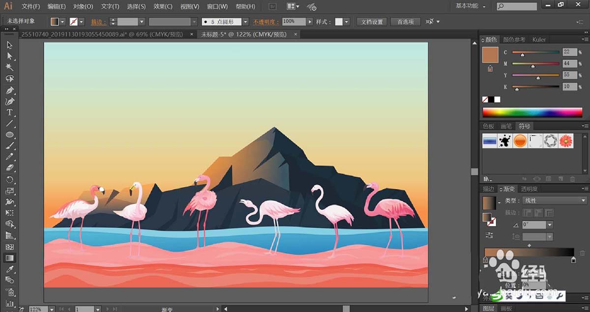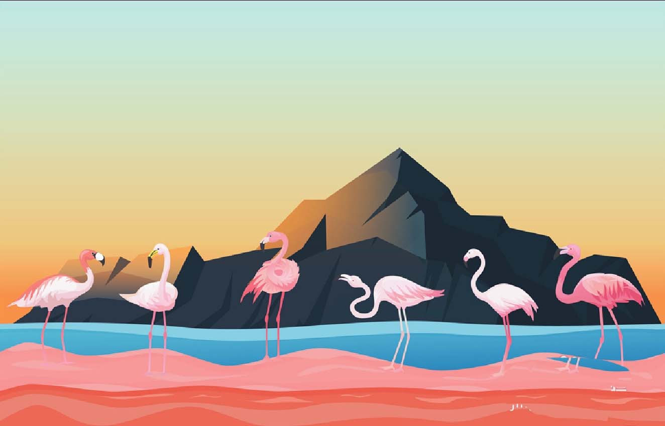 最后,我们画出远处的山体路径再用蓝黑色填充,在向阳的山坡上面使用黄褐色到蓝黑色的渐变填充,天空使用浅黄褐色到天蓝色的渐变填充,完成火烈鸟素材设计。