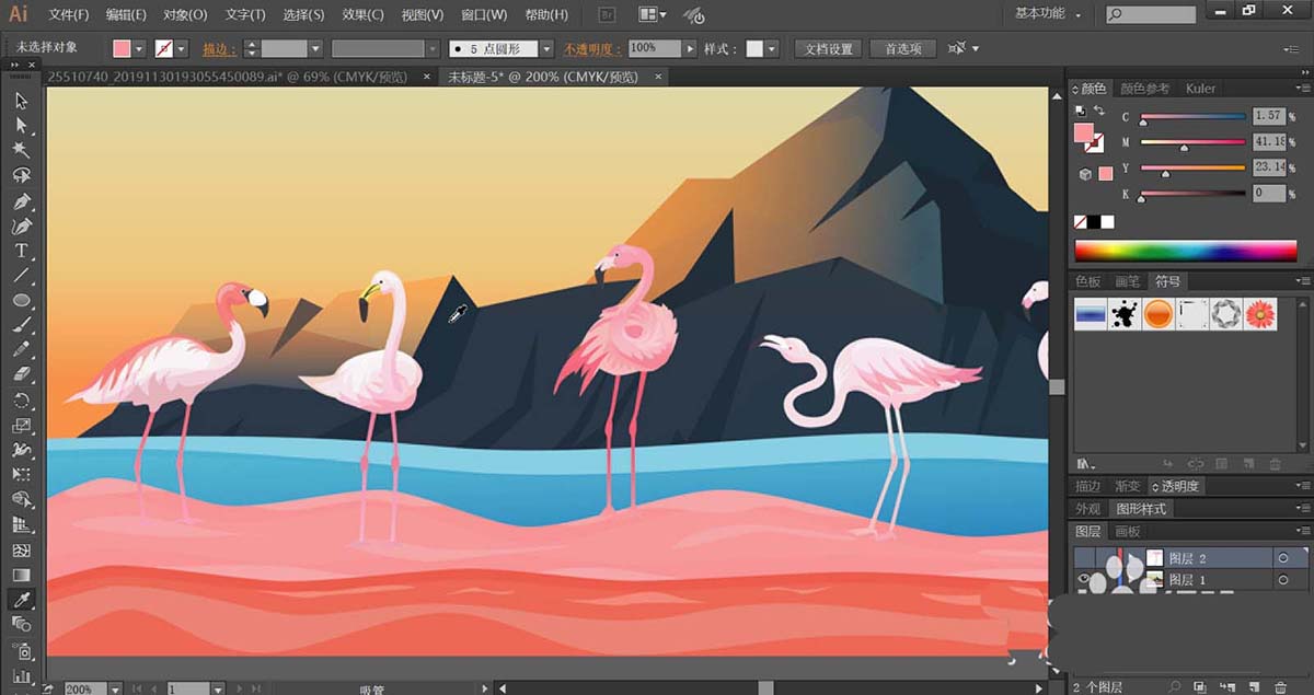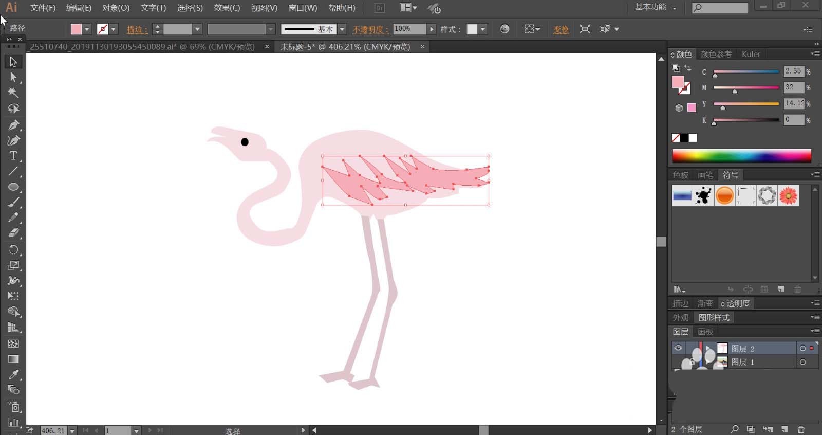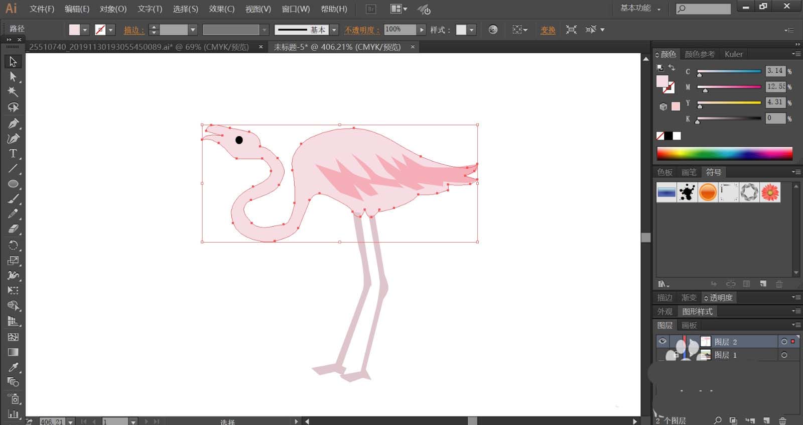 依次使用钢笔勾勒出画面左侧的火烈鸟,再用不同的粉红色分别填充头部、身体、腿部的路径,嘴巴的小鱼使用黑色填充。