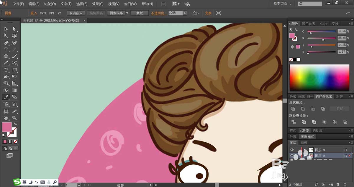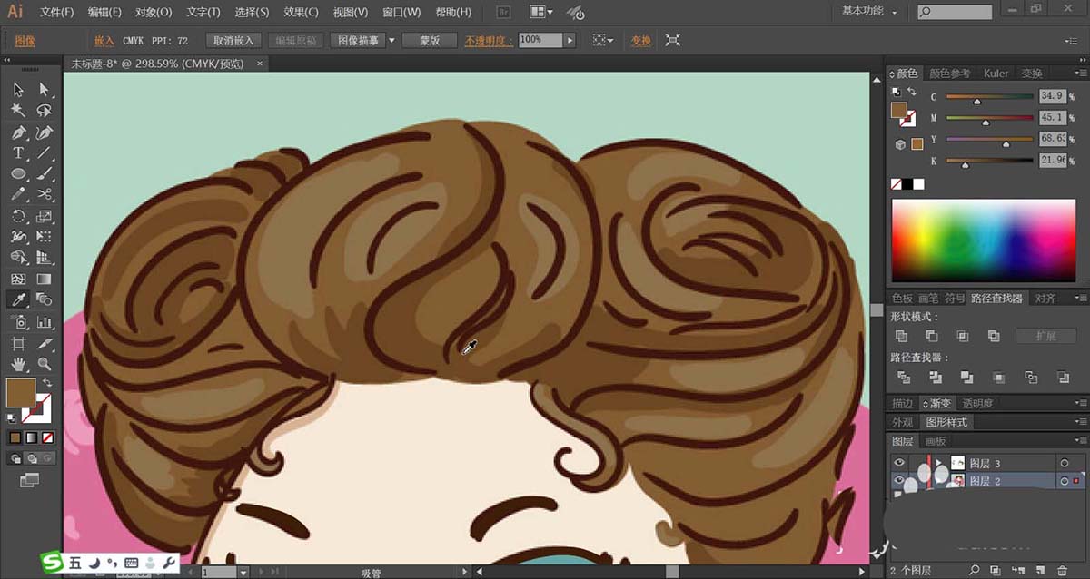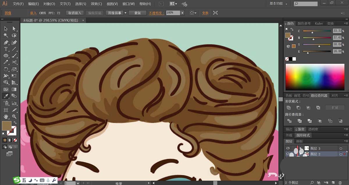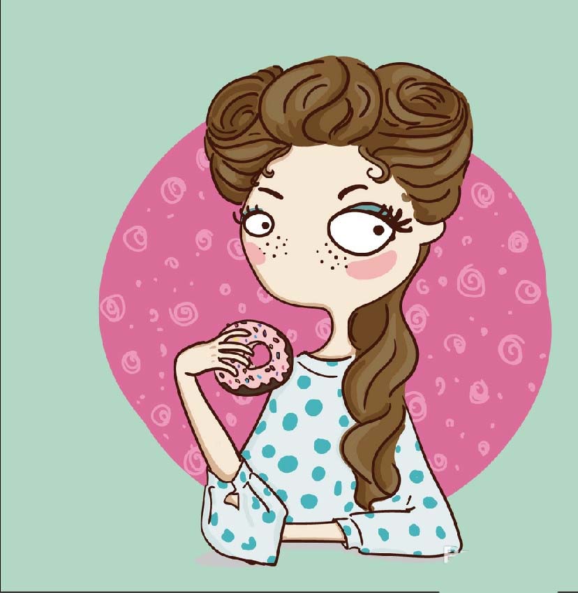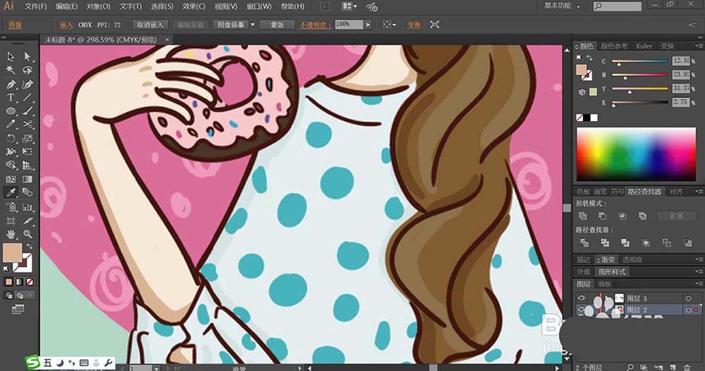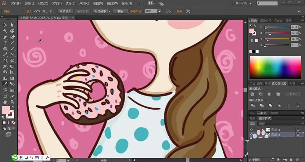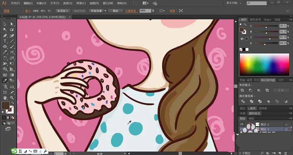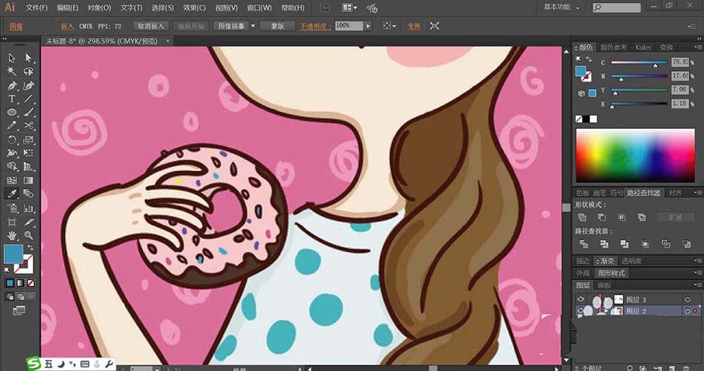 5、这一步,我们使用钢笔画出女孩手里的甜甜圈的路径,再用桃红色与灰褐色搭配分别填充甜甜圈的表面与主体,上面的各种点缀使用蓝色、粉红色、灰褐色来填充。