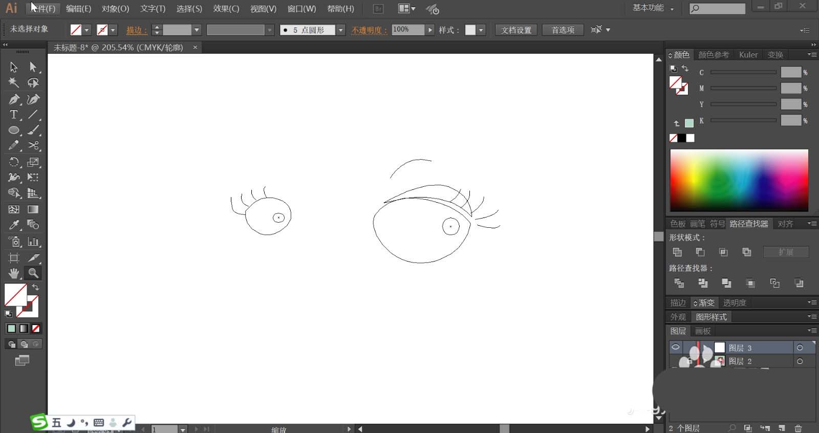 1、使用钢笔画出女孩的左侧与右侧的眼晴,我们画大右侧眼晴,从而产生一种转脸瞪眼的效果,眼睫毛使用钢笔用线条画出,设置线条的宽度在6点左右。