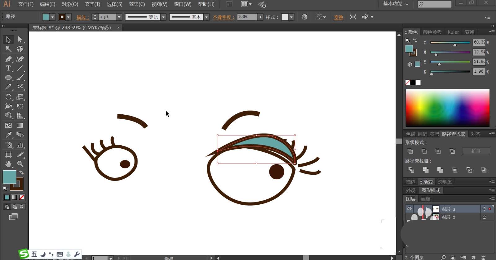2、使用咖啡色描边线条路径,再用白色填充眼晴,瞳孔所在的圆形路径使用咖啡色填充,右侧眼晴的眼帘使用蓝灰色填充。眉毛也使用咖啡色描边呈现,在线条比例上更粗一些。