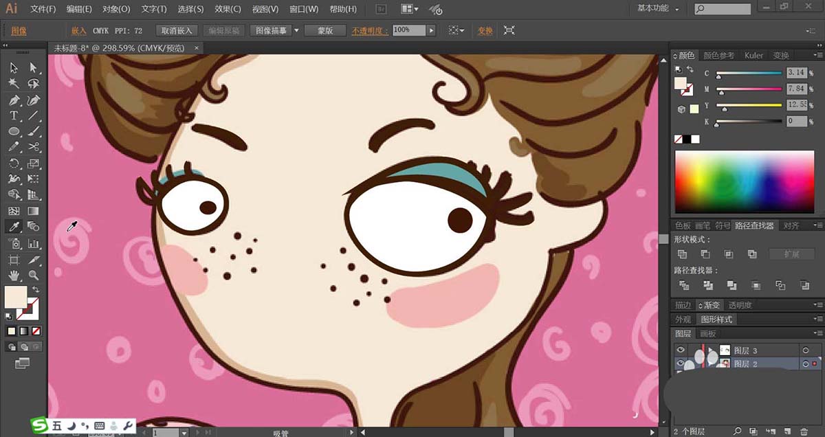 3、接着,我们画出女孩的脸蛋,再用浅桃红色填充,女孩的脸晕使用圆形画出椭圆形状并用粉红色填充,脸上的雀斑使用圆形画出并填充咖啡色。