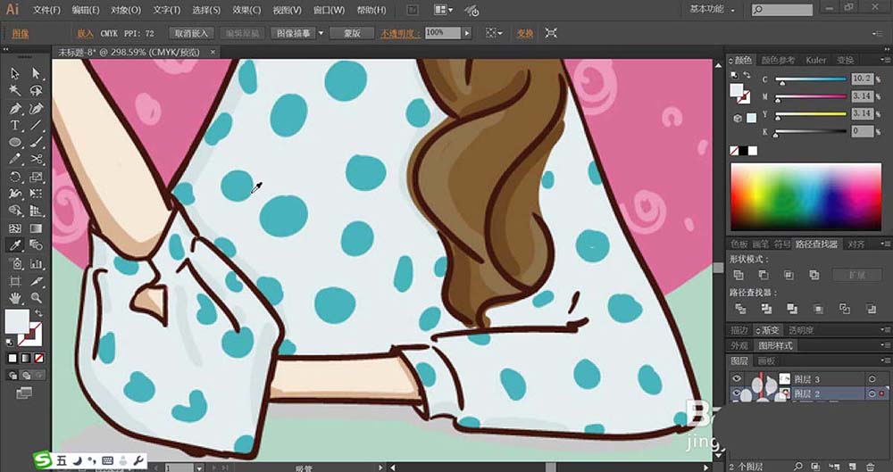 6、接着,我们用钢笔画出女孩的手臂细节,使用浅粉色填充手臂,再用正片叠底的粉色填充手臂边缘的暗光路径。