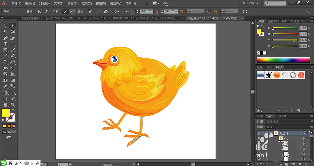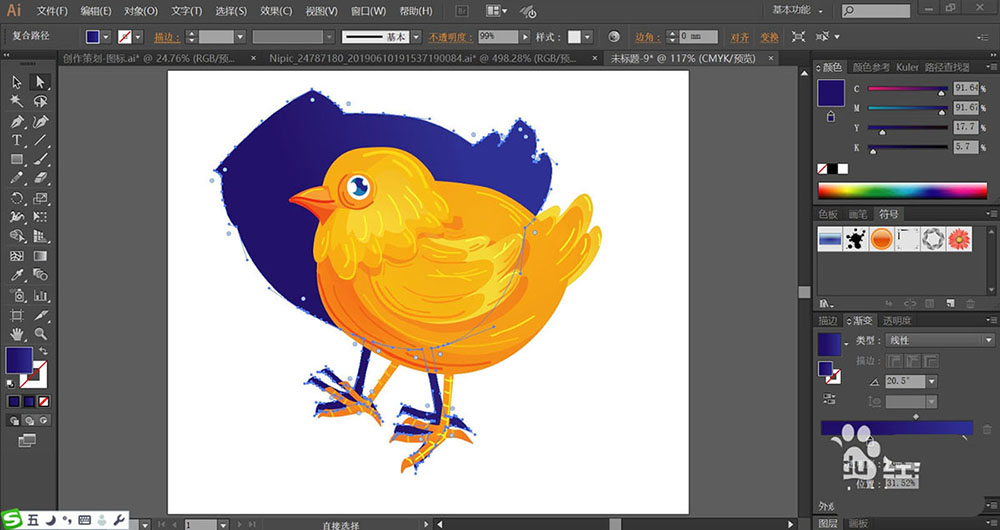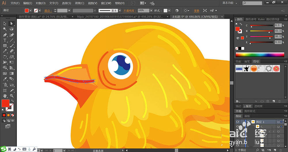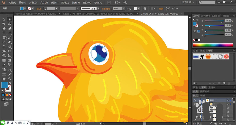 2、使用钢笔与圆形工具绘制出小鸡的身体各个结构的细节路径,包括眼晴与嘴巴,还有翅膀等元素的封闭路径。