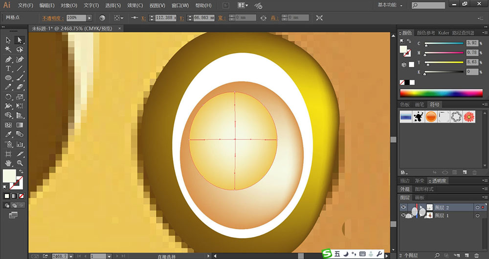2、使用金黄色、红金色、金褐色与浅黄色分别填充宝石的顶层到底层的椭圆路径,再用网格工具点击让其呈现渐变色的效果。