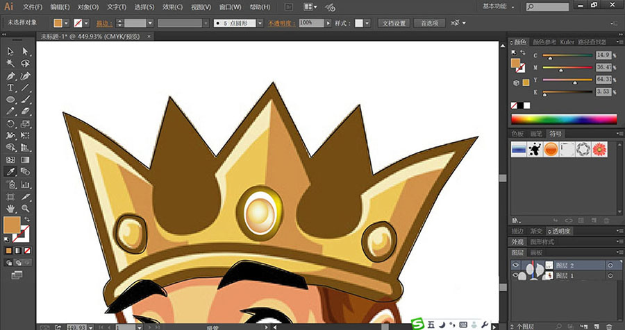 3、用同样的方法绘制出帽子上面的其它两颗宝石,再用金黄色与红金色、金褐色分别填充帽子的表层与底层路径。