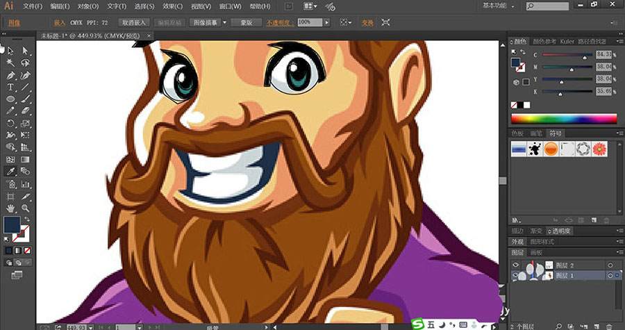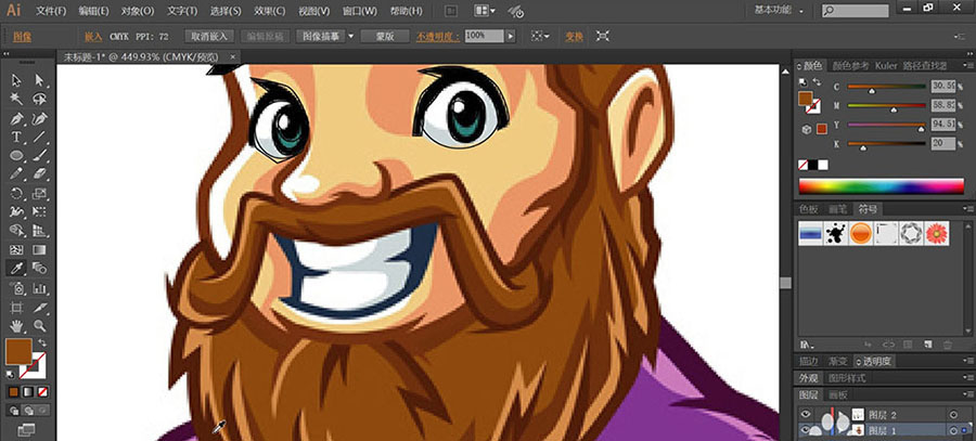 5、男子的胡子使用黄棕色与红棕色填充明暗路径,再用蓝黑色与灰白色填充嘴巴内部的结构。