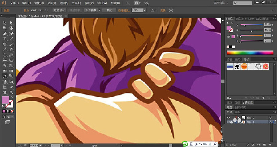 6、男子的上衣使用粉紫色与蓝紫色搭配填充,再用暗紫色进行上衣轮廓的描边。