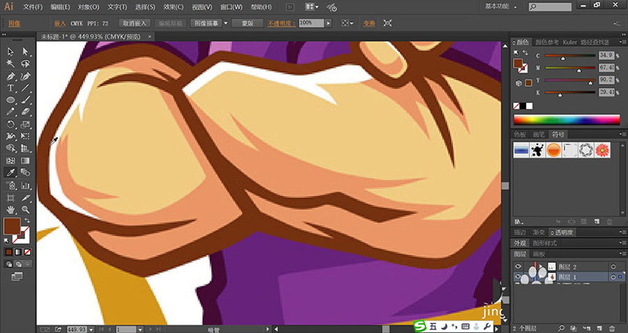 7、男子的手臂使用黄粉色与红粉色搭配填充,再用灰棕色勾勒手臂的边缘。