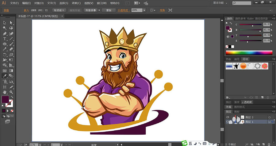 8、最后,我们用金黄色填充男子身体周围的光圈,再用蓝紫色填充光圈下方的圆弧路径,完成国王形象设计。