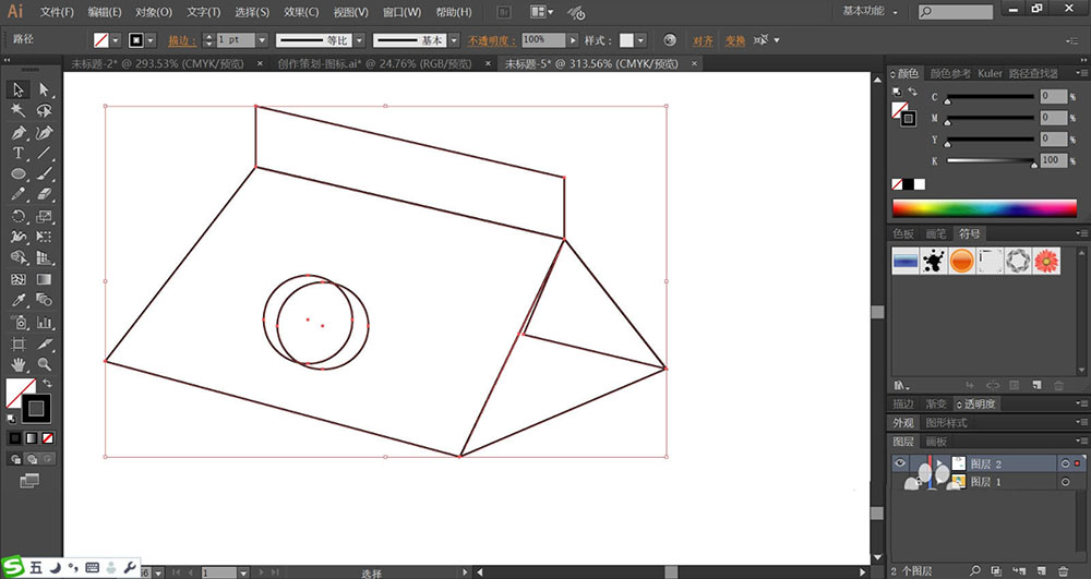 4、使用钢笔画出包装盒顶端的三角结构路径,再用圆形画出开口处的细节路径。
