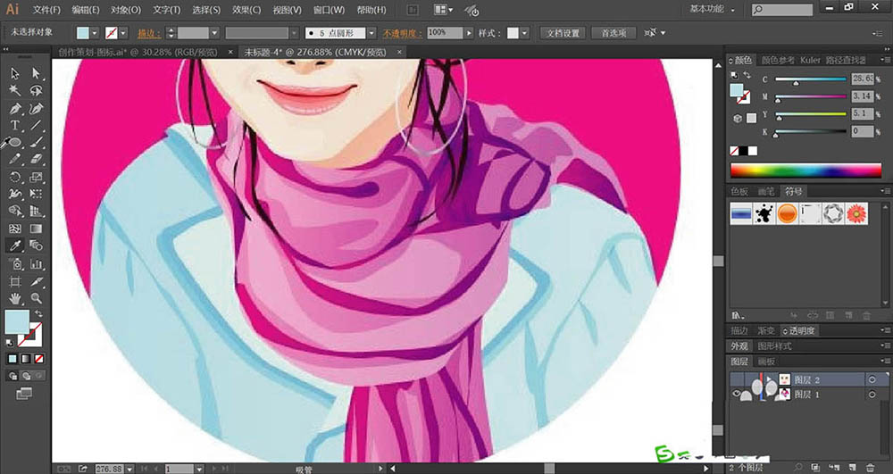 7、使用明暗天蓝色填充女孩的上衣,再用玫瑰红色填充女孩形象所在的背景圆形,完成围巾女孩图片设计。