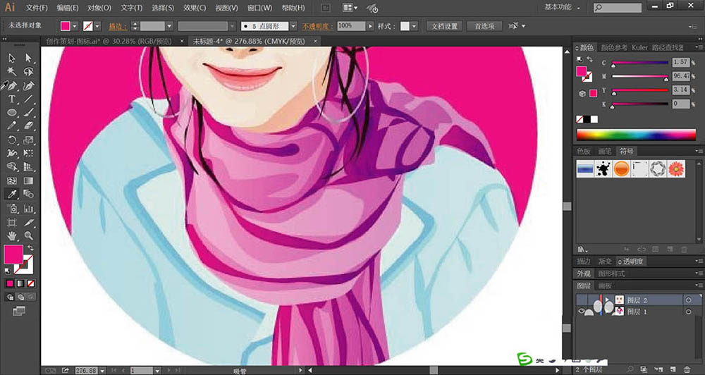 6、这一步,我们用桃红色、品红色、暗品红色搭配填充围巾的高光、主体与暗光区域。