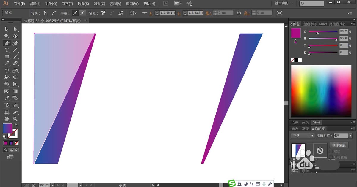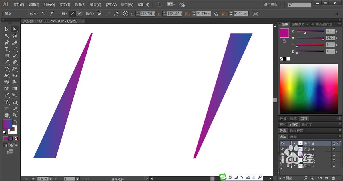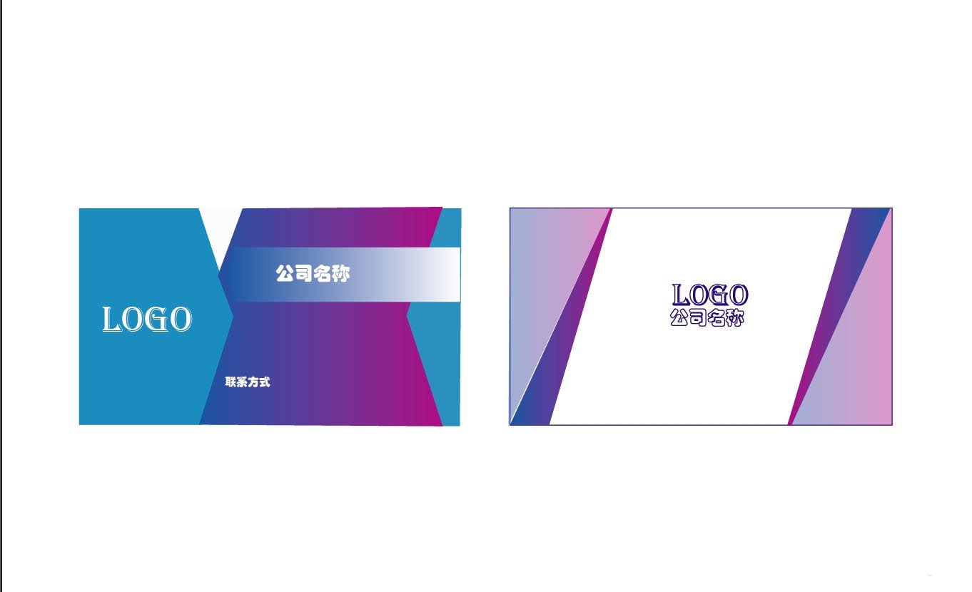6、接着,我们再用矩形画出名片的背面路径,使用钢笔描绘出名片背面的细长尖角路径。我们用蓝紫色到紫红色的渐变填充,再用反向渐变填充名片的右侧尖角。