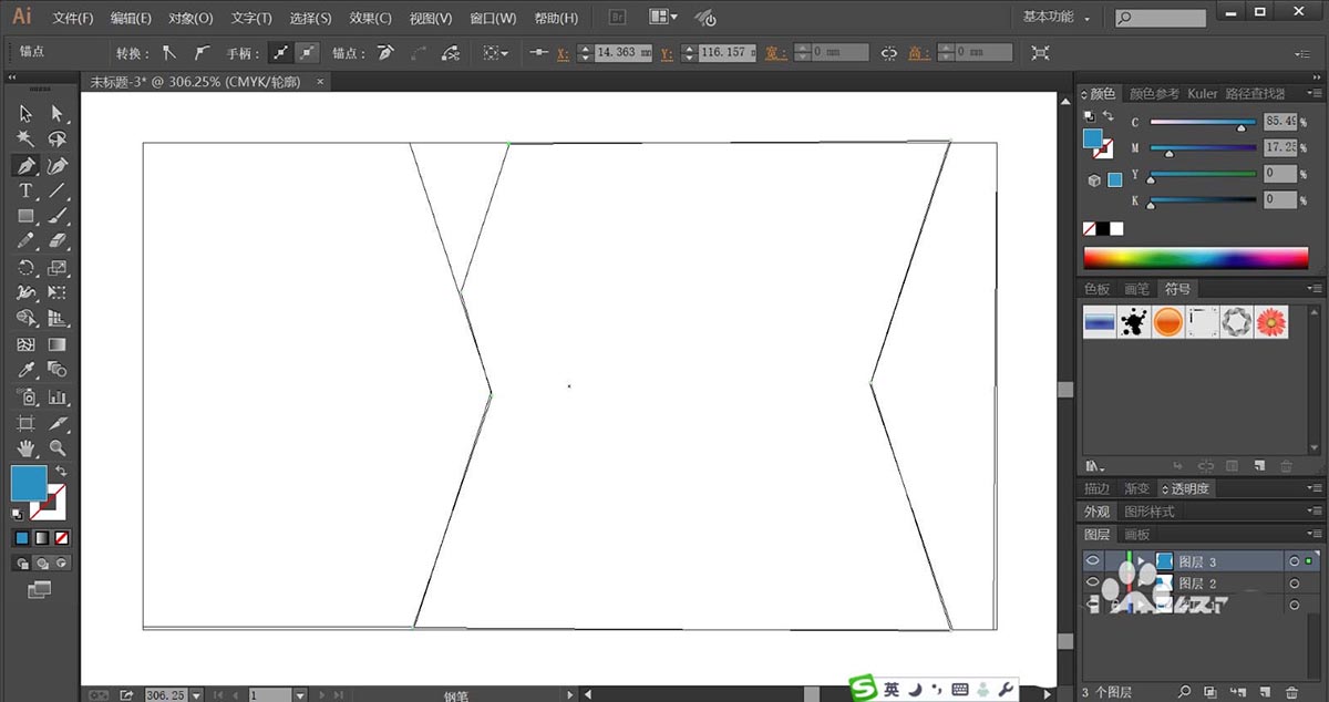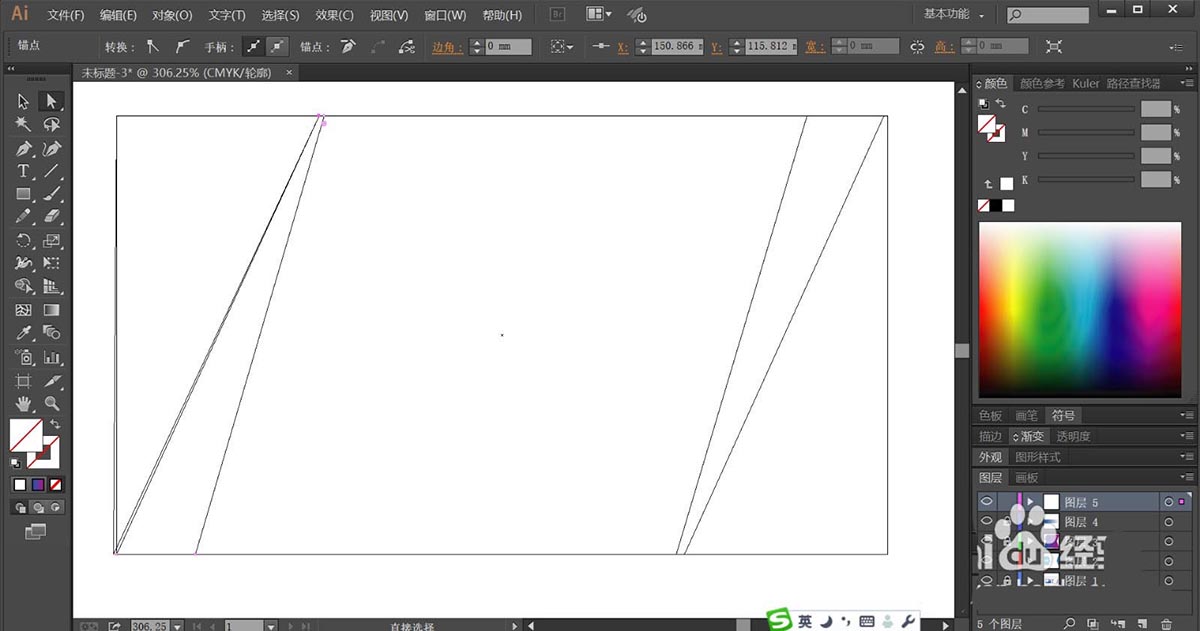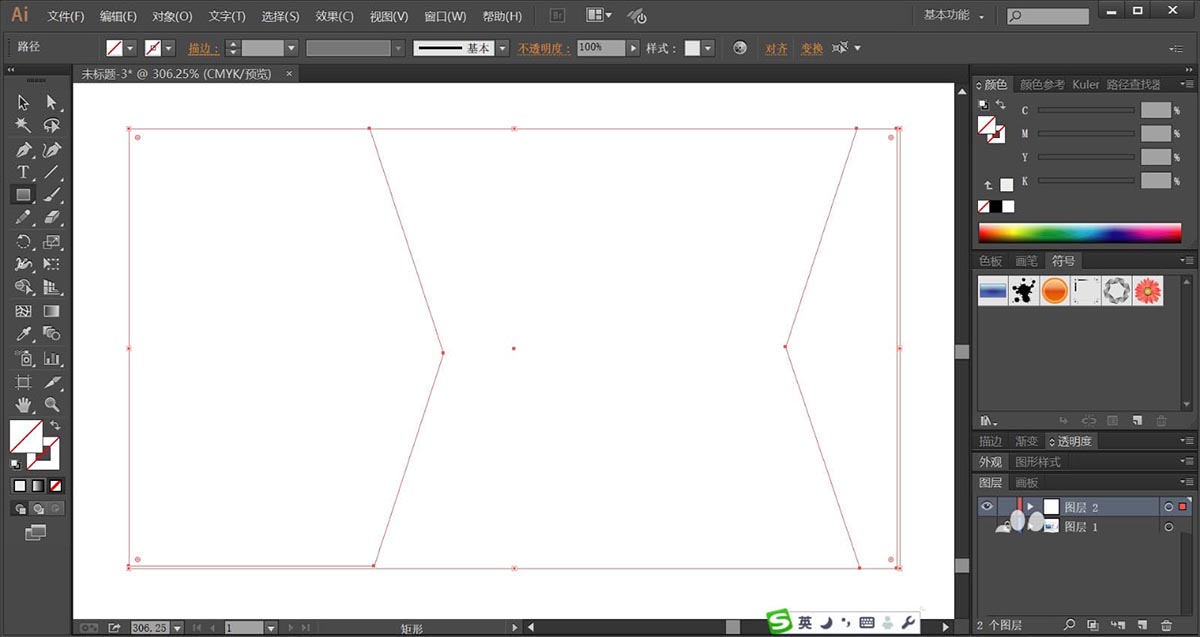 1、使用矩形画出名片的基本结构,再用钢笔画出名片左侧与右侧的不规则尖角形状。