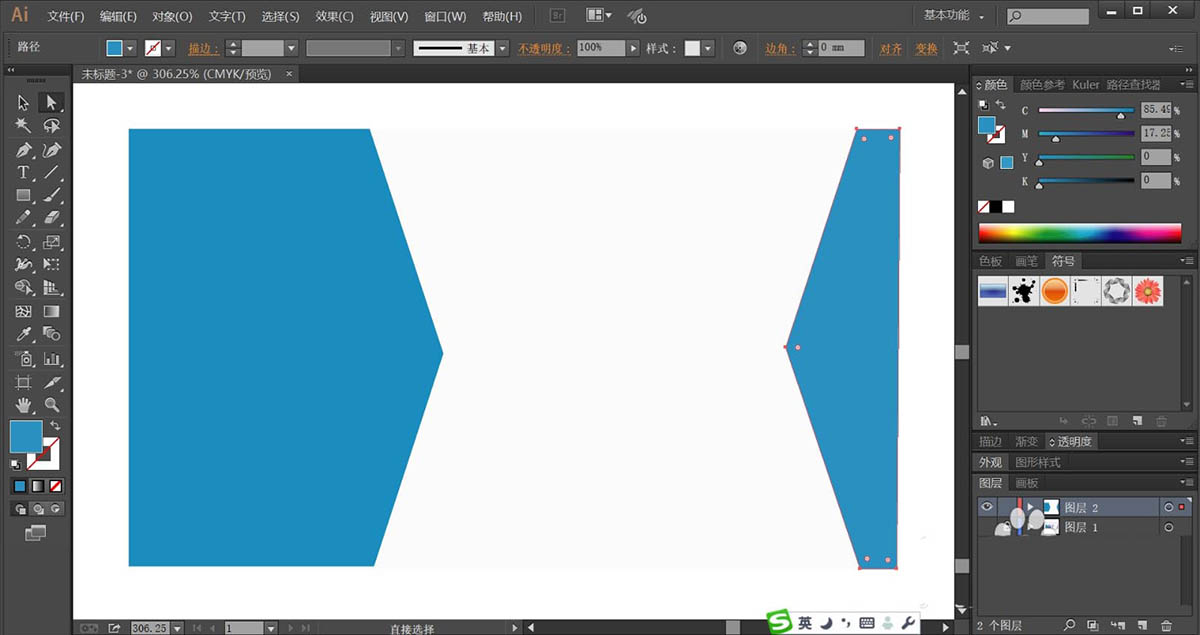 2、使用白色填充名片的背景,再用蓝色描边名片所在的矩形,使用纯蓝色填充名片两端的尖角路径。