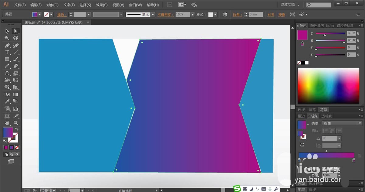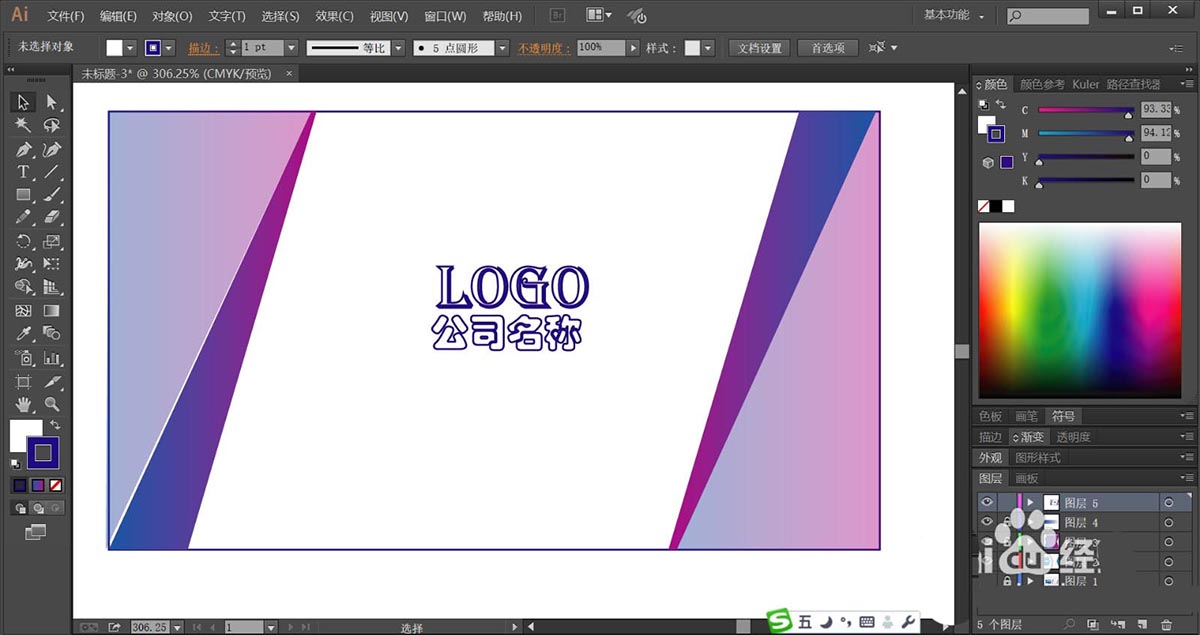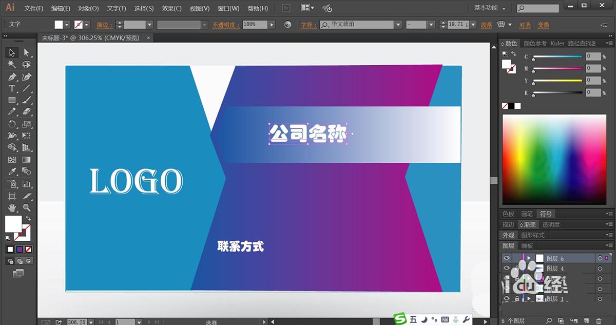 4、设置蓝紫色到紫红色的渐变填充名片的中间结构路径,再用矩形画出名称所在的矩形轨迹,我们用蓝白色的渐变填充。