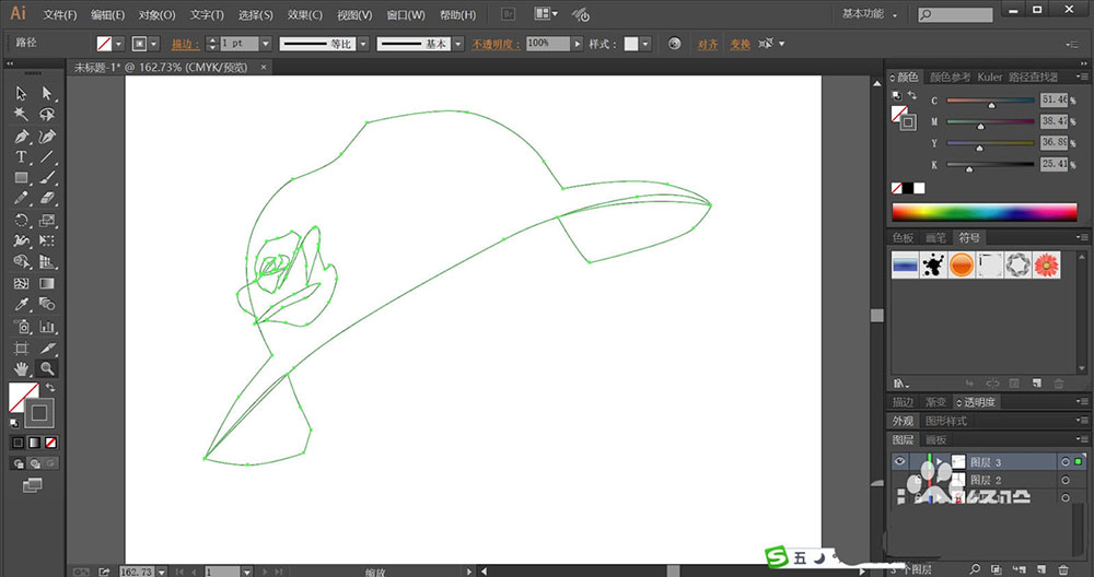 1、使用钢笔画出帽子的顶端与底下的细节结构路径,再画出帽子上面的花朵的花瓣细节路径。
