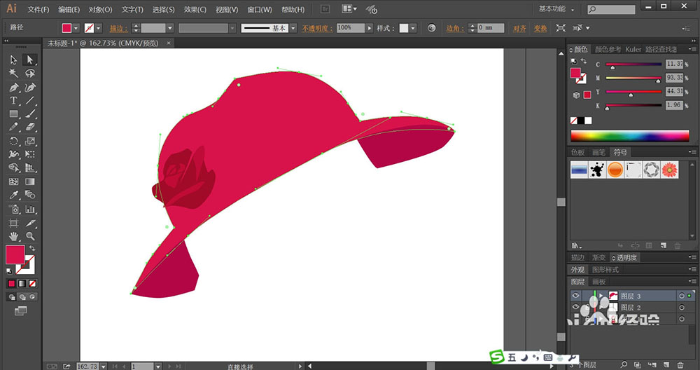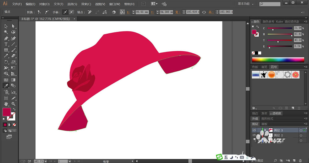 2、使用玫瑰红填充帽子的顶端,再用暗红色填充帽子的底部暗光。
